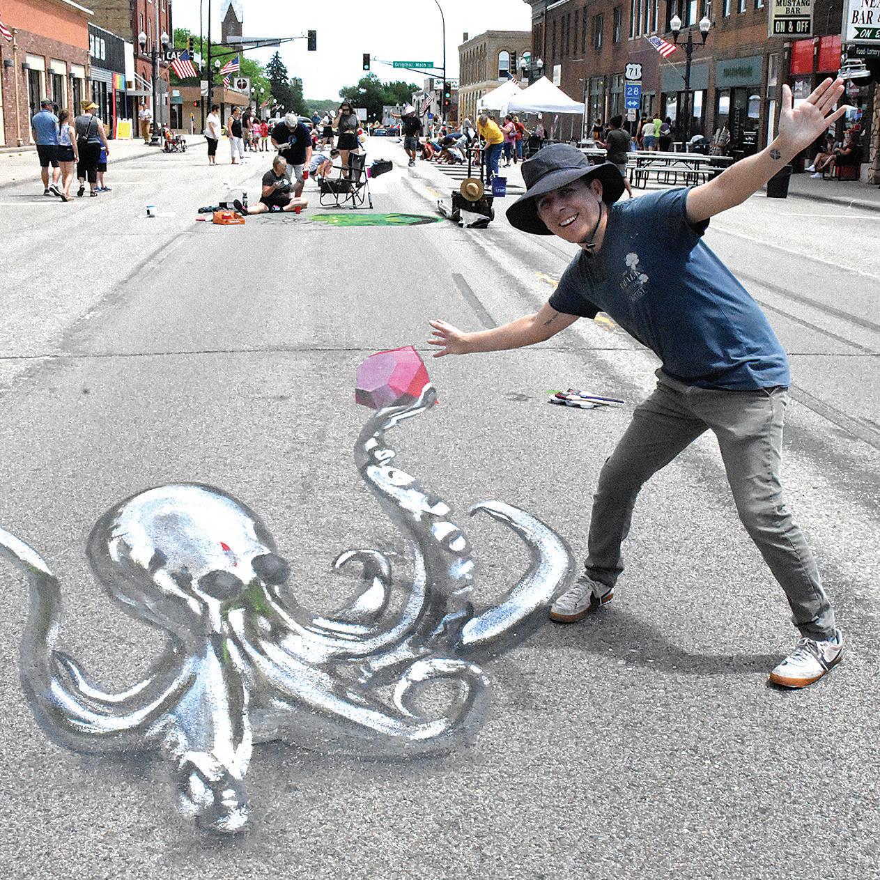 PHOTO BY BEN SONNEK Nestor Mendoza from Sacramento, California, shows off his 3D octopus chalk art June 24 in Sauk Centre. This was the second year for the Chalk in Sauk celebration.