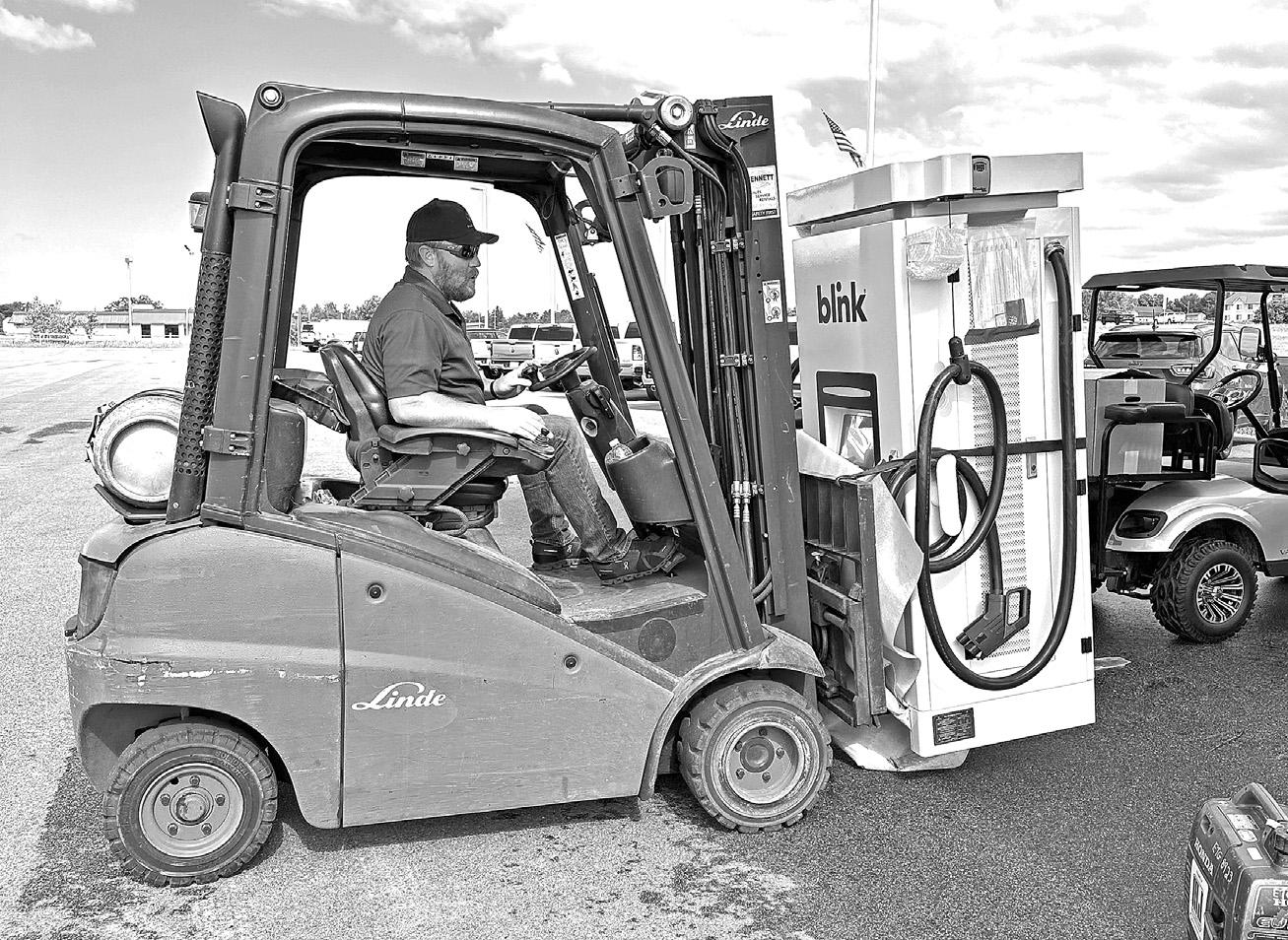 PHOTO SUBMITTED Ross Oehrlein, of JT Electric Service, Inc., moves a charging unit to its location at a public electric vehicle charging station just west of Albany Chrysler Center, Inc., in Albany, July 26. The goal is to have the station operational later this year.
