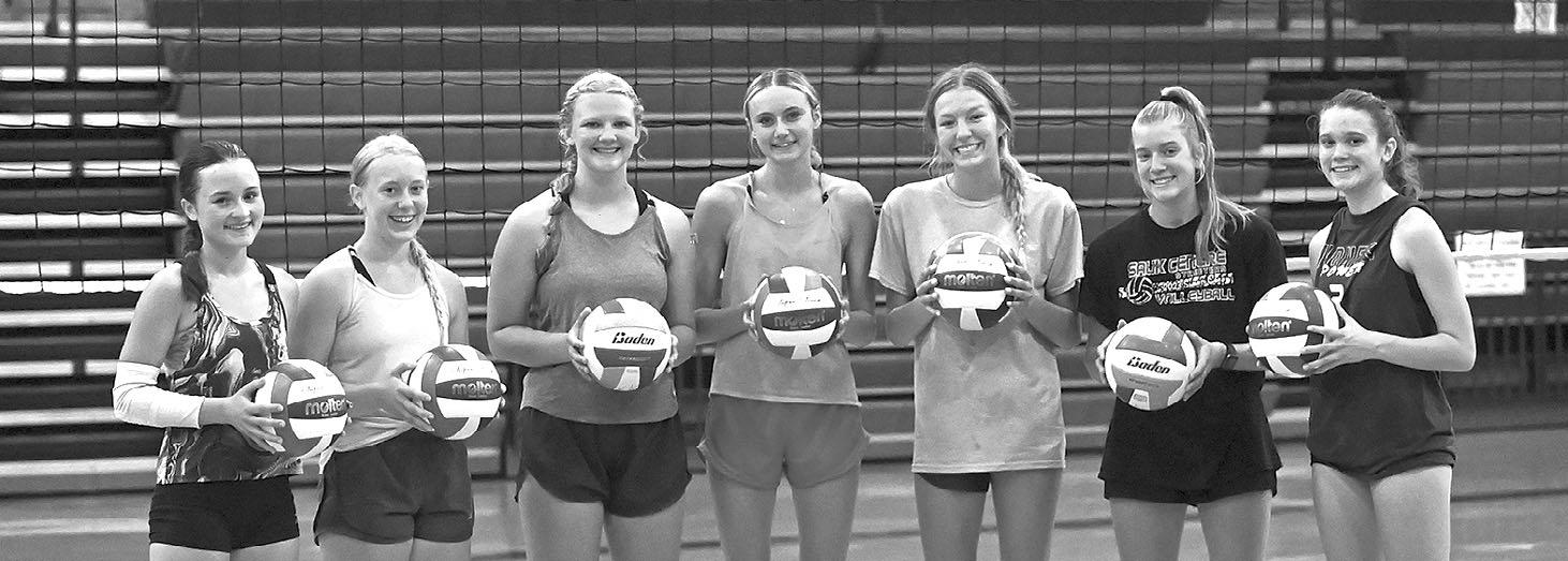 The Sauk Centre Streeters volleyball senior class consists of Raya Sebek (from left), April Klaphake, Nevaeh Hartmann, Isie Kolbo, Brooke Rieland, Emily Peters and Mackenzie Ritter. The Streeters maintain high expectations after a section semifinals loss in 2022 and will rely on chemistry and defense to lead the way.