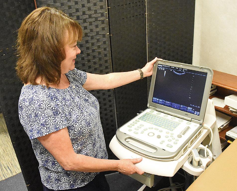Options for Women director Colleen Cianflone boots up the ultrasound machine Aug. 21 at Options for Women in Sauk Centre. The crisis pregnancy center recently lost state support, which represented over a third of the organization’s budget.