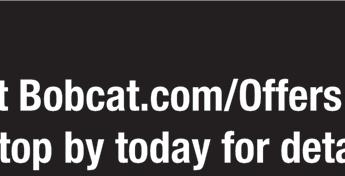 Dassel 888-679-4857 St. Cloud 844-262-2281 Long Prairie 866-514-0982 Willmar 877-484-3211 C AOct7 -1 B -NM DO MORE WHILE saving a lot. *Offer ends 12/31/2023. Available at participating and eligible dealers only. Offer may vary by product type, series, model and select units in dealer’s current inventory. Must take delivery from dealer stock by 12/31/2023. Offers available on new equipment in US and Canada only. Some restrictions apply. Length of contract and rate may vary. Monthly payment subject to change. Prior purchases not eligible. See dealer for details. Financing provided on approval of credit by authorized Bobcat finance providers to well-qualified buyers. All finance programs and rates are subject to final approval by the applicable Bobcat finance provider and are subject to change at any time without notice. Administrative fees may apply. Offer not available to government accounts, national accounts and municipal/utility bid customers. Bobcat Company reserves the right to extend or discontinue any of these programs at any time without prior notice. In lieu of financing receive rebates up to $12,000 USD* OR 0% APR for up to 36 months* with rebates up to $7,000 USD* compact loader Financing & Cash Rebates