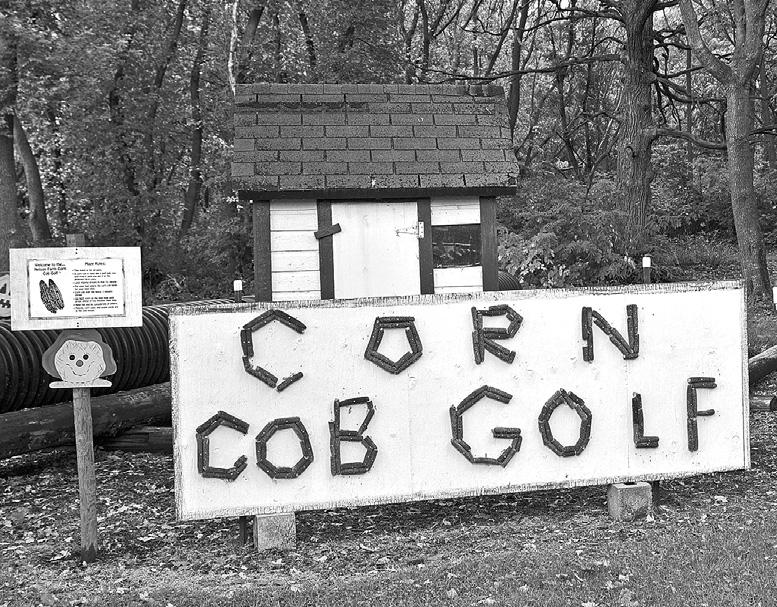 The start of corn cob golf is marked by this sign written in corn cobs Sept. 25 at Nelson Farm near Litchfield. Corn cob golf is a game invented by Don Nelson.