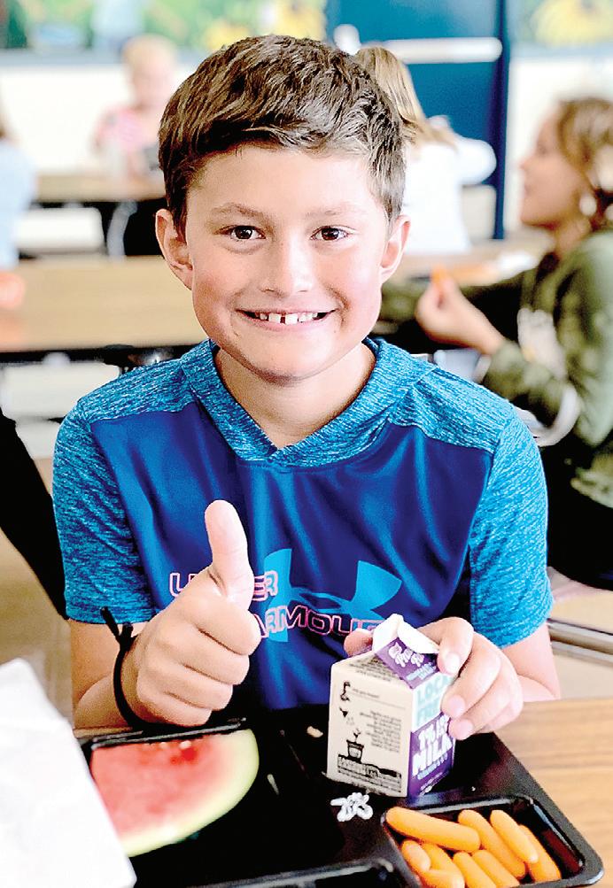 (Right) Matthew Desens eats lunch at DoverEyota Elementary School. Area farmers, including his family’s business, Goldenrust Farms, provide fresh produce and meat to the school district.