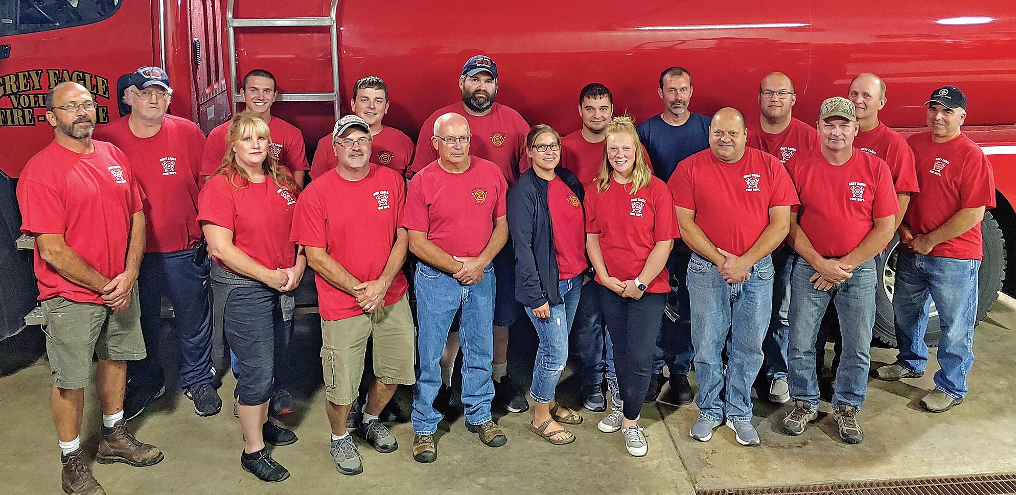 The Grey Eagle Fire Department members are Loren Bitz (front, from left), JoAnn Cynbaluk, Paul Thiesen, Jon Newberg, Cyndie Zinniel, Sam Pohlmann, Dan Berscheid, Tom Berscheit; (back, from left) Joe Arnzen, Nicholas Berscheit, Brandon Defoe, Glen Becker, Derek Pohlmann, Randy Muellner, Troy Thomford, Larry Brake, Bill Berscheit. Not pictured are Zach Bruder, Brenda Muellner-McDermond, Matt Zinniel.