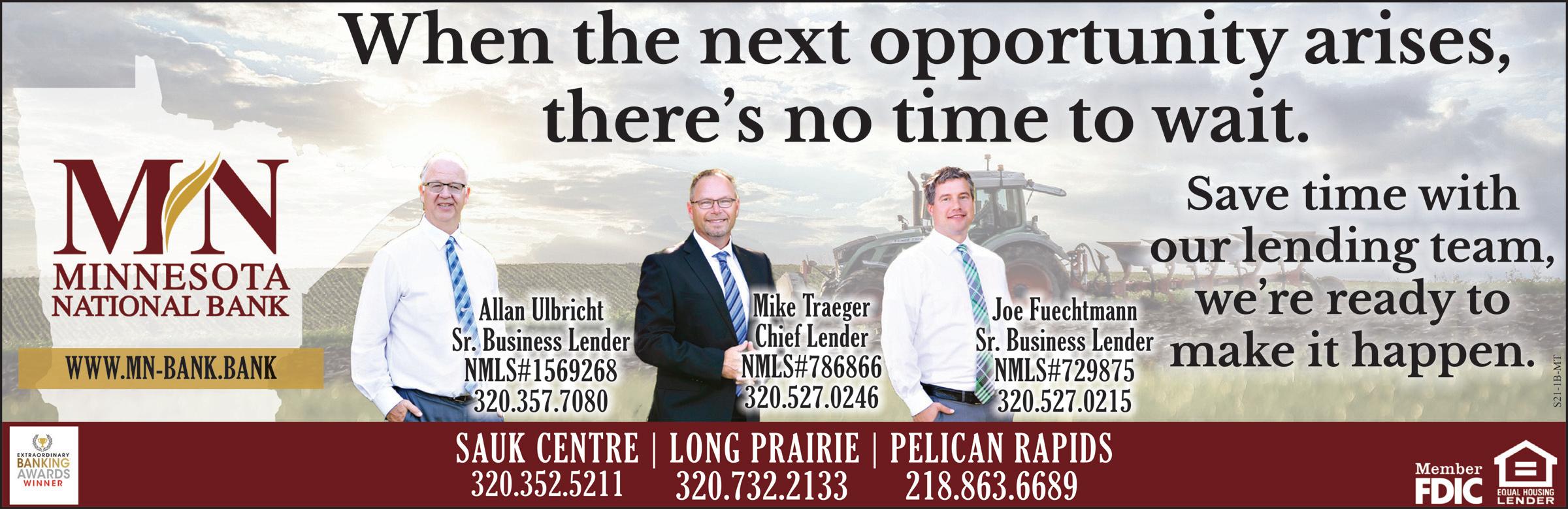 MN 10098 County 11, Sauk Centre 320.223.2852 Brandon Petermeier W a l k e r Walker P l u m b i n g Plumbing P.O.Box 134 • Villard, MN 56385 JOE WALKER HEATING & SEWER SERVICE Lic. #61280-PM LICENSED • BONDED • INSURED 320.554.6601 • 320.766.0341 P.O. Box 148 • Long Prairie, MN 56347 320-732-8359 LONG PRAIRIE PACKING CO. CATTLE BUYING STATION Drainage LLC. D Established in 1975 Jason Marthaler 320-249-6062 Howard Marthaler 320-250-2984 • Ditching • Tiling • Excavating • Ag Waste Systems 1800 2nd St. S. • Sauk Centre, MN David Weber Cell: 320-290-0160 Lic. #MR057710 1180 Sinclair Lewis Avenue • Sauk Centre, MN Office: 320-351-4100 • Fax: 320-351-4115 AIR CONDITIONING CENTRAL&HEATING SERVICE, INC. centralheating@arvig.net Plumbing Installation Custom Sheet Metal New Construction & Remodeling 107 Main Street • Grey Eagle, MN Ben B. Ettle MN Lic. # IN-40286154 Kutter Insurance Agency, Inc. Michael W. Kutter MN Lic. # IN-22558 320-285-2299 • Kutt@meltel.net “For all your insurance needs” •COMPETITIVE RATES • EXCELLENT SERVICE •FLEXIBLE BILLING • STRONG COMPANIES •Business • Auto • Home • Farm • Crop Hail • Life • Health 320-252-6650 • advantageoneins.com ALBANY • HOLDINGFORD • LONG PRAIRIE • MELROSE • PIERZ • SAUK CENTRE • ST. CLOUD Offices in: SAUK CENTRE LONG PRAIRIE PELICAN RAPIDS www.mn-bank.bank Member FDIC PROUD HERITAGE! Celebrat ing A Celebrating A