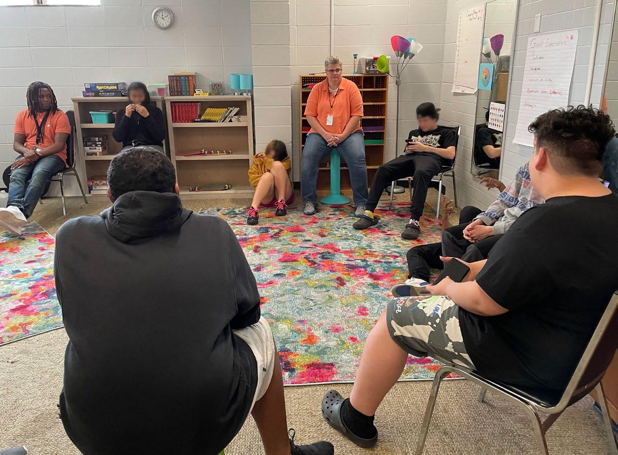 Resilience Coaches, teacher, and students start the day in a circle to check-in with each child. Note: Some student faces have been blurred to respect their privacy.