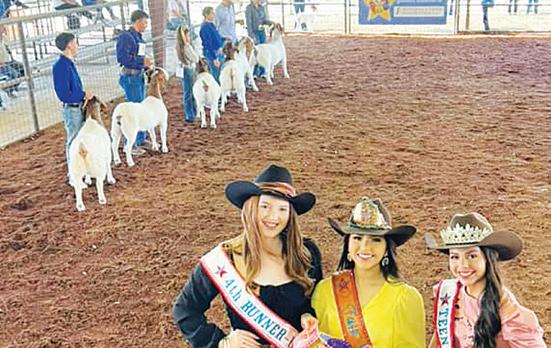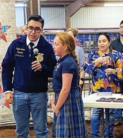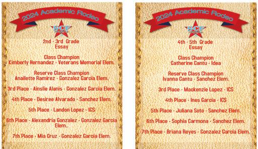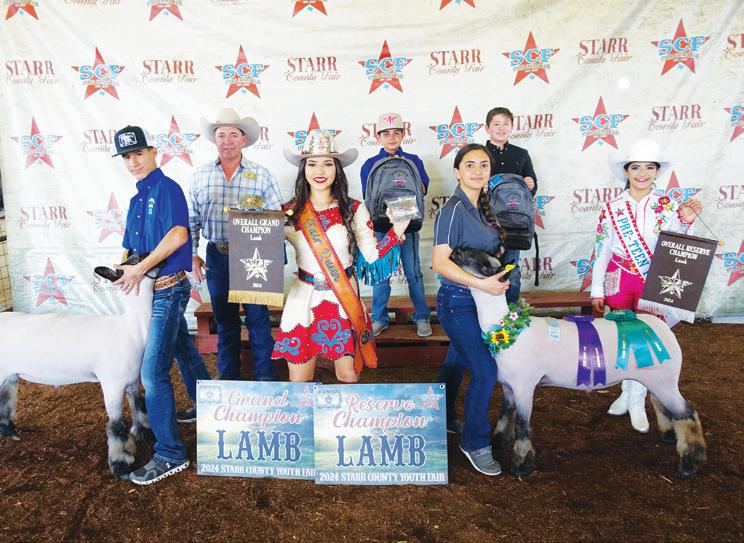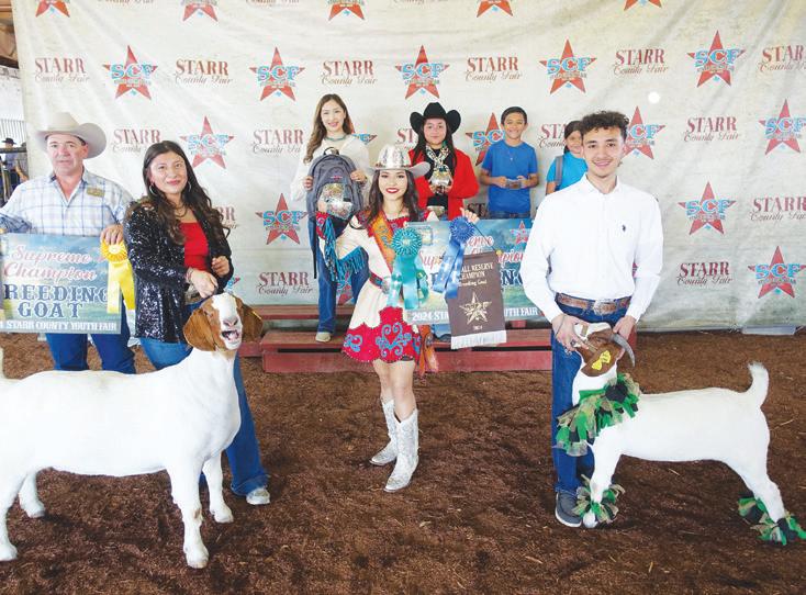 STARR COUNTY TOWN CRIER, YOUTH FAIR APRIL 17, 2024, PAGE 9 STARR COUNTY TOWN CRIER, YOUTH FAIR APRIL 17, 2024, PAGE 8 STEERS: Grand Champion, Leonardo Gonzalez, Vaquero 4-H; Reserve Champion, Arturo Alvirde III, Grulla FFA; Showmanship – Senior Division: Grand, Vivien Canales, Lucky Star 4-H; Reserve, Lia Gutierrez, Lucky Star 4-H; Intermediate Division: Grand, Isabella Carrera, Lucky Star 4-H; Reserve, Gavin Villarreal, SI FFA; Junior Division: Grand, Dylan Laurel, Rio FFA; Reserve, Aranza Gonzalez, Vaquero 4-H. BREEDING GOAT DIVISION: Grand Champion, Naitssa Ramirez, Rio FFA; Reserve Champion, Anthony Aguilar, Grulla FFA; Showmanship – Senior Division: Grand, Naitssa Ramirez, Rio FFA; Reserve, Daniella Fuentes, Rio FFA; Intermediate Division: Grand, Aubree Rodriguez, Rio FFA; Reserve, Jesus Gonzalez, Rattler 4-H; Junior Division: Grand, Justin Cody Salinas, Rio FFA, Reserve, Emalyn Barrera, Rio FFA. QUEEN AND COURT: Starr County Fair Queen Jenelle Jay Gonzalez, Rio Grande City HS; 1st R-up Victoria Lee Salinas, RGCHS; 2nd R-up Lia Kathleen Gutierrez, also Miss Photogenic, RGCHS; 3rd R-up Ava Christine Brown, PECHS; 4th R-up Alma Ruby Pena, RGCHS; Miss Congeniality Andrea Carolina Munoz; Teen Princess Sarah Lee Barrera, Ac2E Middle School; Pre-Teen Princess Allison Drew Fleming, General Ricardo Sanchez Elem.; Petite Princess Debanhy Alya Guerrero, GRSE; Precious Princess Geraldine Marie Sarabia, Early Childhood Academy. SCHOLARSHIP