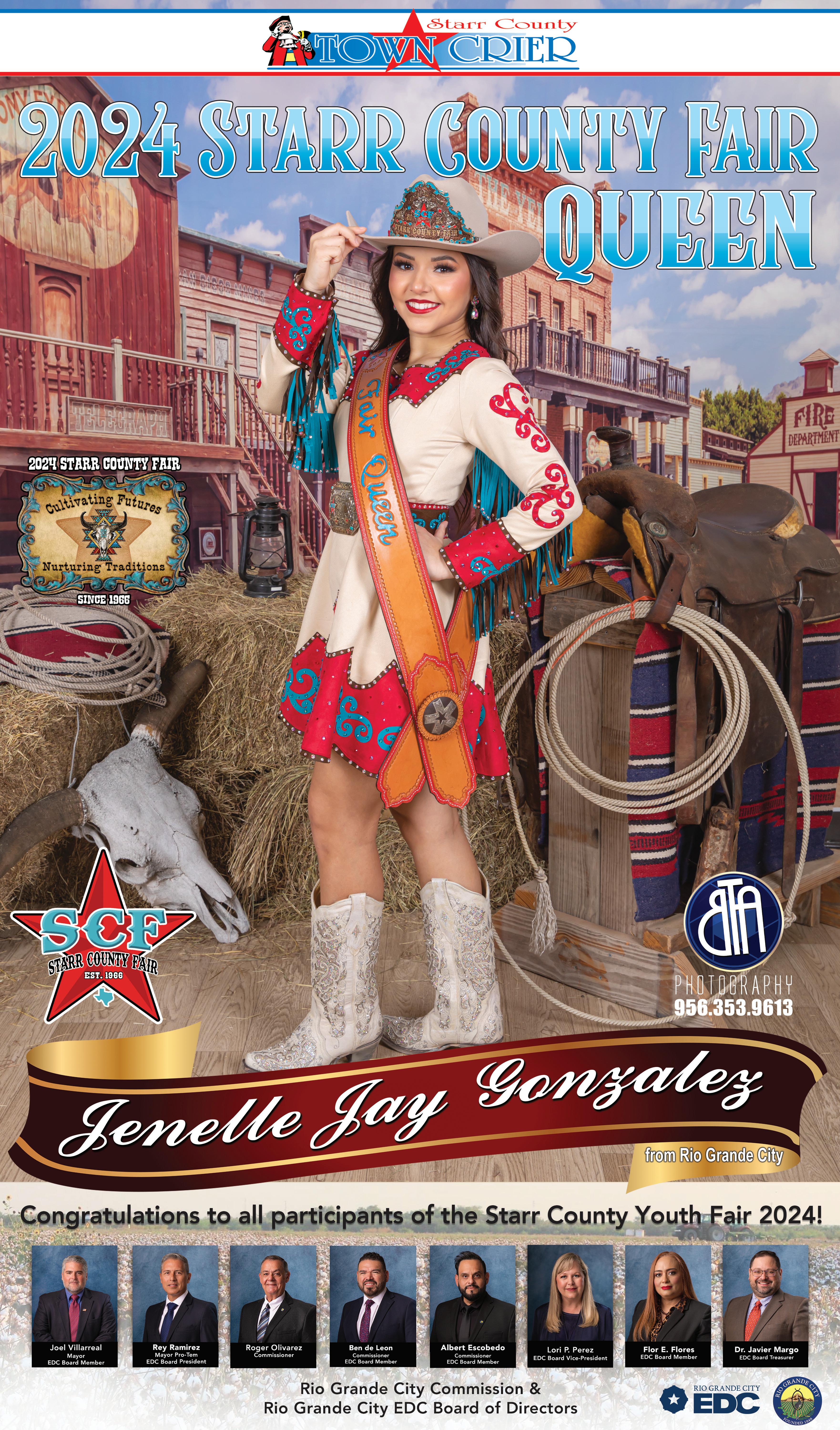 The 2024 Starr County Fair Queen and her court were crowned at the annual Youth Fair Pageant held January 27 at the RGCGISD Fort Ringgold Auditorium. Jenelle Jay Gonzalez is the 2024 Starr County Fair Queen. A sophomore at Rio Grande City High School, fifteen year old Jenelle is the daughter of Jay and April Gonzalez.