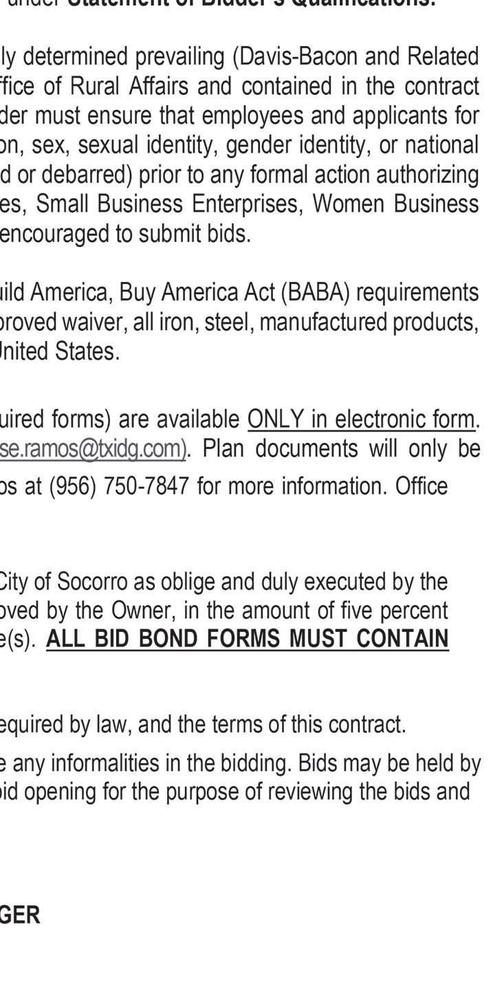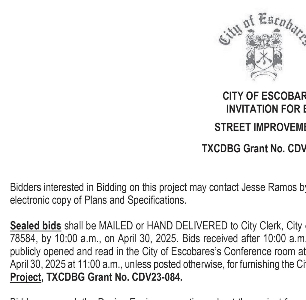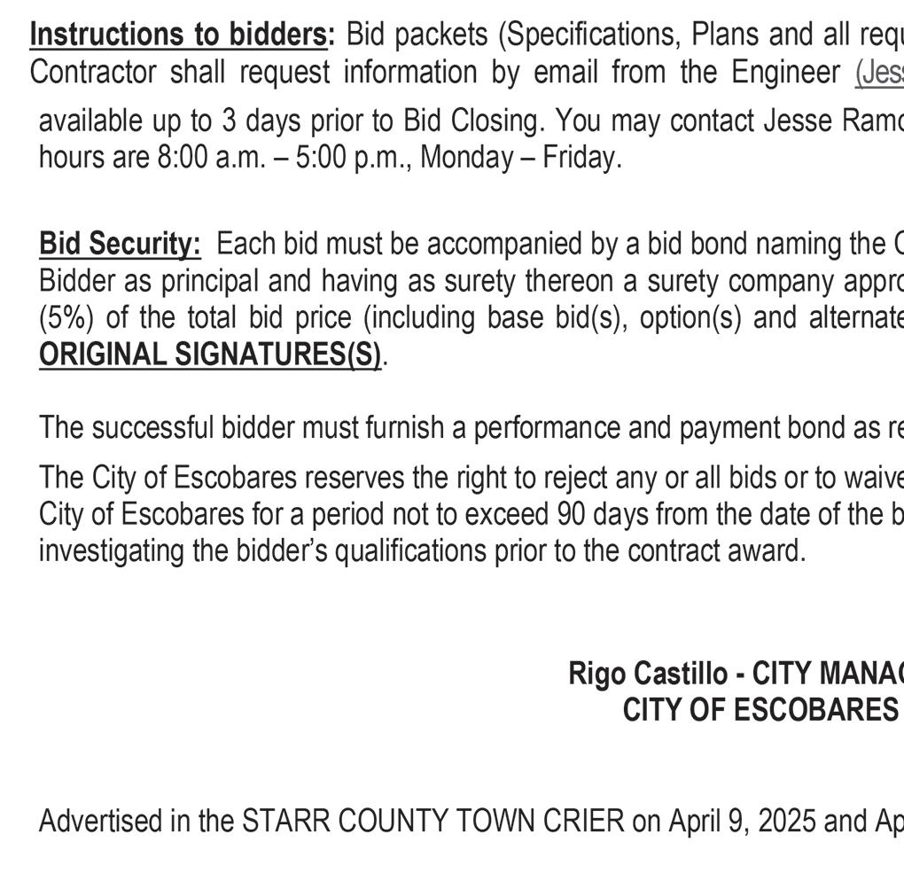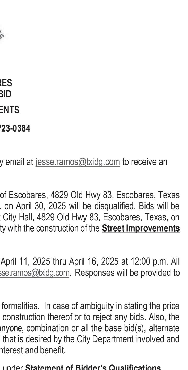 A pre-bid meeting will be held on Friday, April 25, 2025 at 10:00 A.M. at the City Rio Grande City – City Hall Chambers located at 5332 E. U.S. Highway 83 – Suite A., Rio Grande City, Texas. All prospective bidders are encouraged to attend.