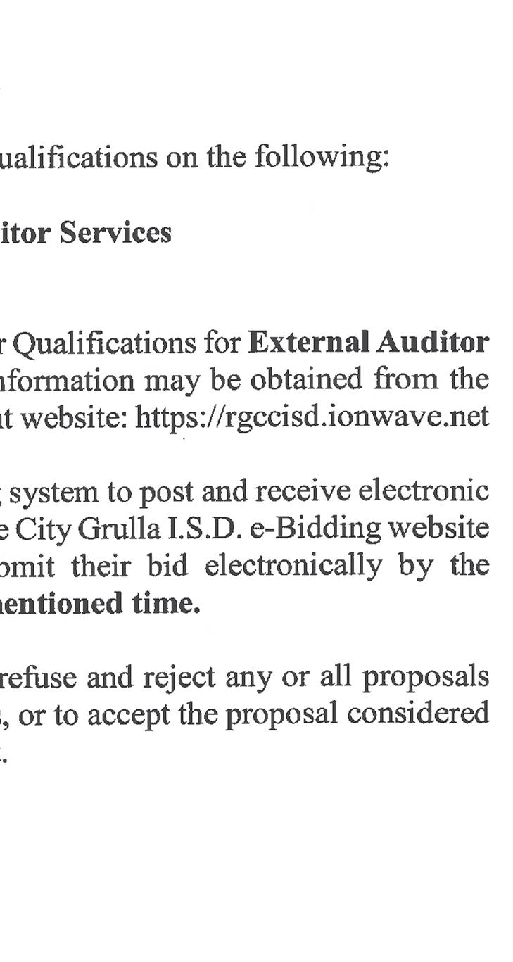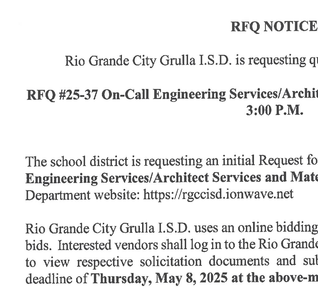 One (1) copy of the qualifications statement must be received by the City by no later than 4:00 PM (Central) on April 24, 2025, at the offices of the City of Roma, 201 W. Convent Blvd., Roma, Texas 78584, Attn: Alex Barrera, City Manager.