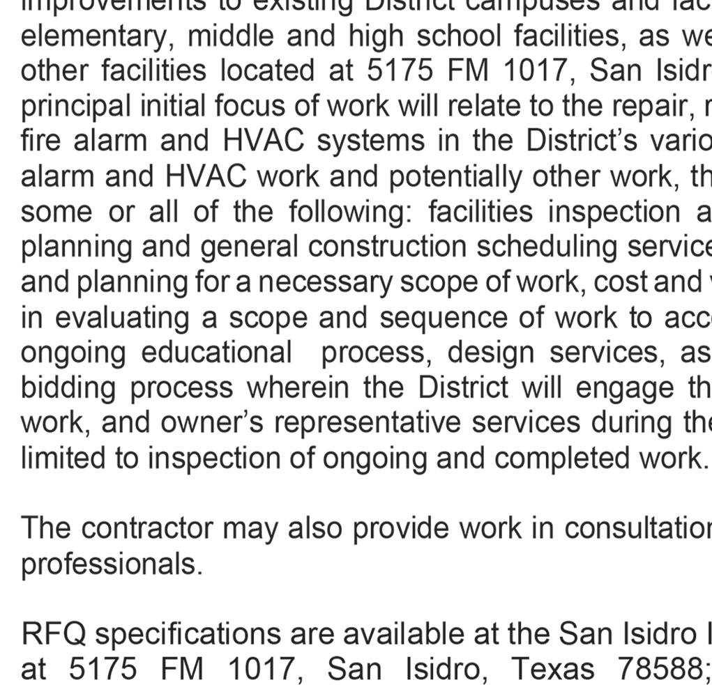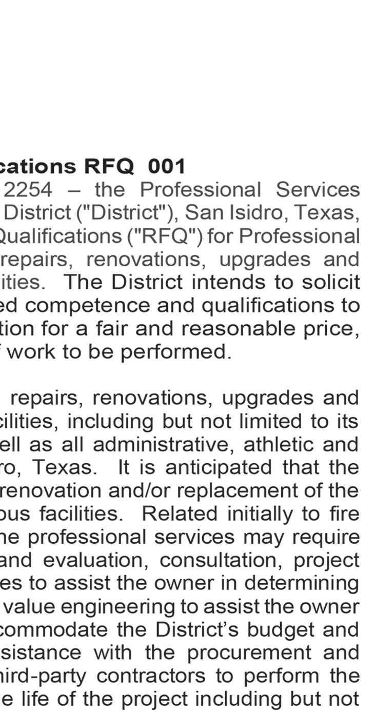 The City of Roma, Texas (the “City”) requests the submission of qualifications statements, which will lead to the possible award of contracts to provide services for a project involving the City’s waterworks system associated with TxDOT utility relocations.