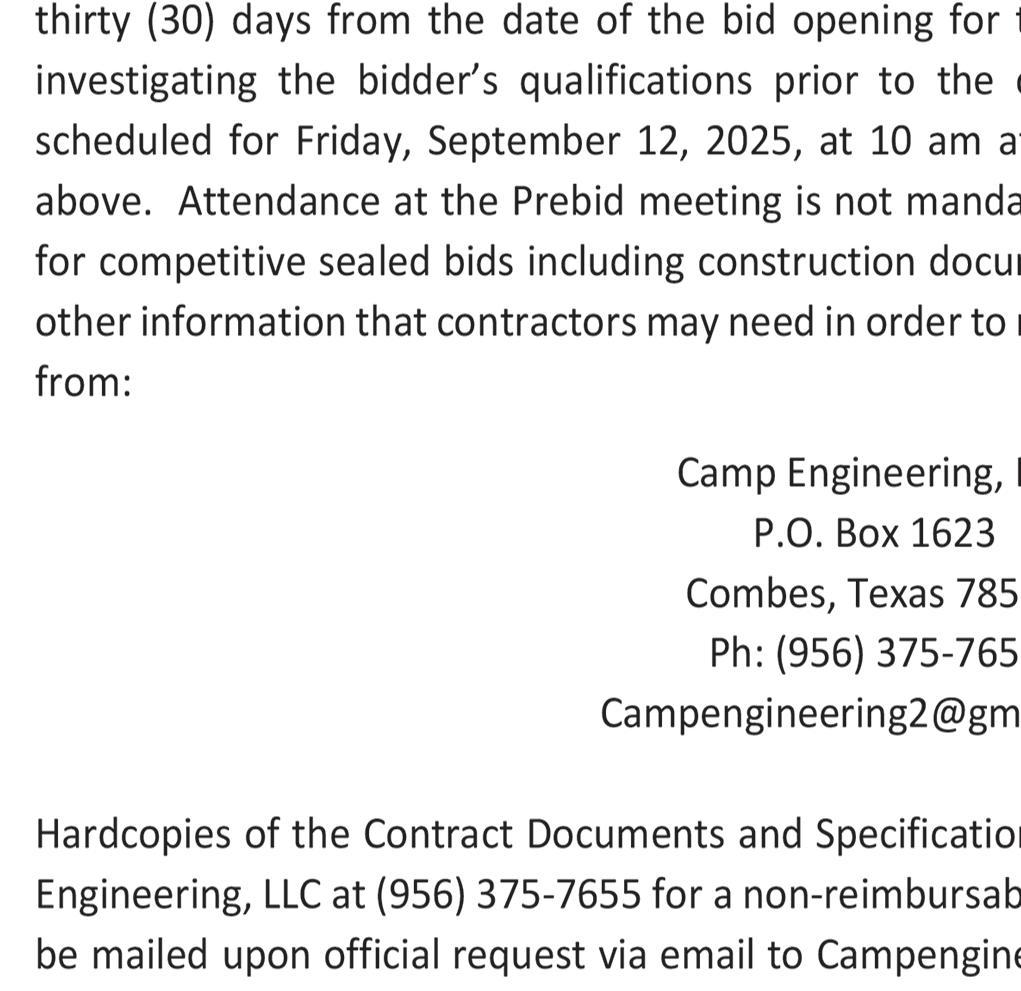 The City of Rio Grande City will be receiving bids for the renovations of the Rio Grande City Animal Control Building on Wednesday, September 3, 2025 at 11:00 AM. Bids are to be submitted to the City Secretary’s Office located at 5332 E. US Highway 83, Rio Grande City, Texas 78582. All submitted bids will be gathered and taken to the City Hall – Chambers located at 5332 E. US Highway 83 – Suite A., Rio Grande City, Texas 78582, to be publicly opened and read aloud.