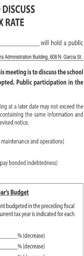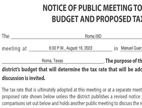 e Board of Trustees of South Texas College will meet on the 22nd day of August 2023, at 5:00 p.m., at the Pecan Campus, Ann Richards Administration Building, Second Floor in the Board Room at 3201 W. Pecan Blvd., McAllen, Texas for the purpose of conducting a Public Hearing for the general public to be present and participate in the Hearing relating to the adoption of the Fiscal Year 2023-2024 South Texas College Budget. A copy of the proposed budget may be viewed at the O ce of the Vice President for Finance and Administrative Services located at 3201 W. Pecan Blvd., Ann Richards Administration Building, Second Floor, Room 230, McAllen, Hidalgo County, Texas. At the termination of the Public Hearing, the Board of Trustees of South Texas College may adopt the budget for the Fiscal Year 2023-2024 at such meeting or may adopt the budget at a subsequent meeting.