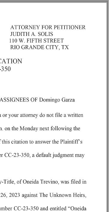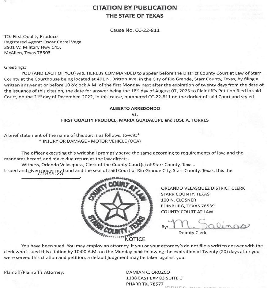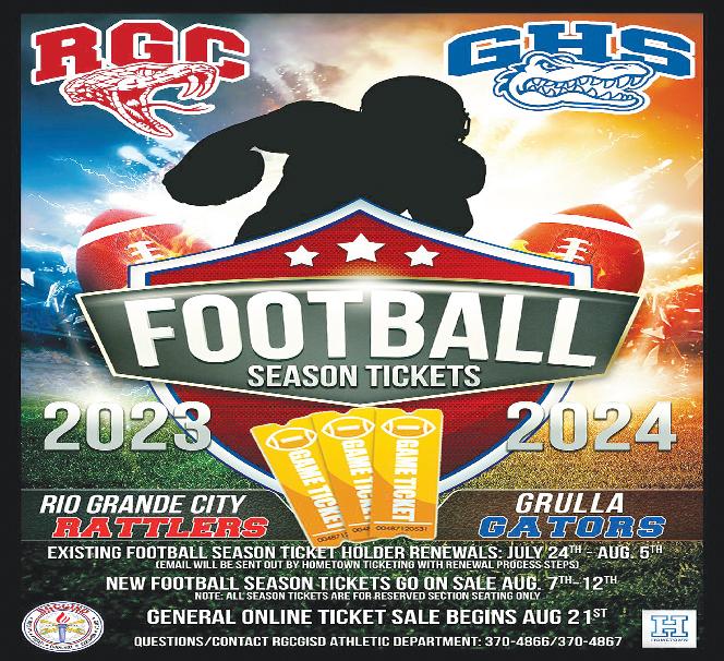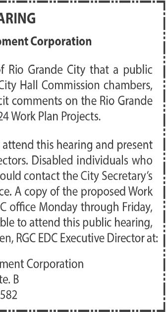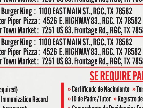 487-2440 300 East Main St. R.G.C. STARR VISION CENTER Dr. Angie Ramirez erapeutic Optometrist 488-0808 280 W. 2nd St. R.G.C. CASTAÑEDA Auto Insurance & Bail Bonds 487-7000 487-2596 4350 E. US HWY 83 R.G.C. • Individual • Partnership • Corporations • LLC’s • Bookkeeping • Payroll • Financial Statements • Form 2290 • IRS Audit Representation Mario A. Méndez, EA Licensed to practice before the IRS (Internal Revenue Service) 317-1124 (956) 201 S. San Antonio. St. Rio Grande City, TX (NEW LOCATION) Vol. 38, No. 31 WEEKLY WEDNESDAY • AUGUST 2, 2023 Office (956) 487-6544 - Fax (956) 487-6165 - E-Mail: sctc78582@aol.com - www.starrcountytowncrier.com The Law Office Of 956-317-1167 206 N. Britton Ave. Ste.B, R.G.C. jmchemagarza@gmail.com J.M. “Chema” Garza Criminal Cases (Federal/State) Car Accidents/ 18 Wheeler Divorces • Real Estate/Deeds Dr. Raymond Cruz Best FAMILY & COSMETIC DENTISTRY Dental Insurance, Medicaid and Chip Accepted 419 East 2nd St. Rio Grande City, Tx. 487-2999 311 E Main St Rio Grande City TX 78582-4448 Phone (956) 487-3925 Installment Loans J.M. “Chuy” Alvarez CHUY Alvarez 501 N. Britton Ave • Rio Grande City, Texas 956-487-4871 Cell: 956-208-0282 NOT CERTIFIED BY THE TEXAS BOARD OF LEGAL SPECIALIZATION ATTORNEY AT LAW The RGCGISD incoming 7th, 8th, and 9th graders participated in the Rattler Football Camp, hosted by middle school and high school coaches from the Rattler Football Program. Thank you to all the participants for attending the annual Rattler Summer Camp.