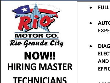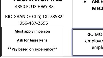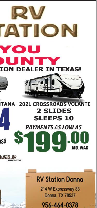 STARR COUNTY TOWN CRIER, AUGUST 2, 2023, PAGE 10 APARTMENT FOR RENT 1 bedroom, 1 bath w/ laundry, dinning, and living room appliances included. Newly remodeled 1 block away from North Grammar Elementary in RGC. For info. call 956-487-8989 DUPLEX FOR RENT NEWLY RENOVATED WITH GRANITE TOPS 3bdrm., 2 bath, Off of Los Alvarez Rd., RGC. $750 mo. + $600 dep. 1yr lease. (956) 844-0650 STK#24902C 2020 Ford Edge People across the Valley come home to Rio Motor Co. for big savings and family-friendly service! No Matter Where You Live, Come Home! www.riomotors.com (956) 487-2596 · 1-800-509-0003 Rolando Flores 956-416-8945 Paco Cantu 956-208-1821 STK# 25003A ONLY 16K MILES!!! NICE! 2019 VW Passat SE STK# 25026A 2022 Chrysler 300 2023 GMC Acadia Denali STK# MANAGER $PECIAL MANAGER $PECIAL STK# 24968A JUST ARRIVED JUSTARRIVED $31,995 $32,995 $49,995 $36,995 $36,995 2020 GMC Terrain Denali $26,995 $32,995$35,995