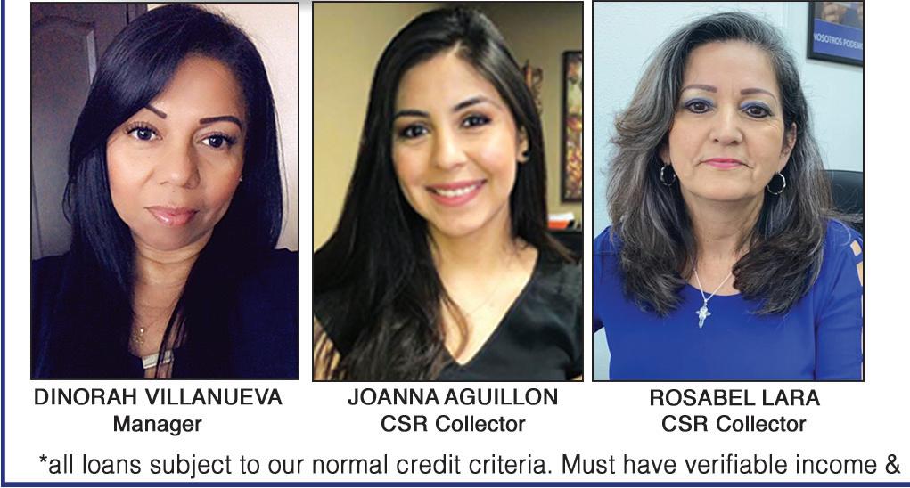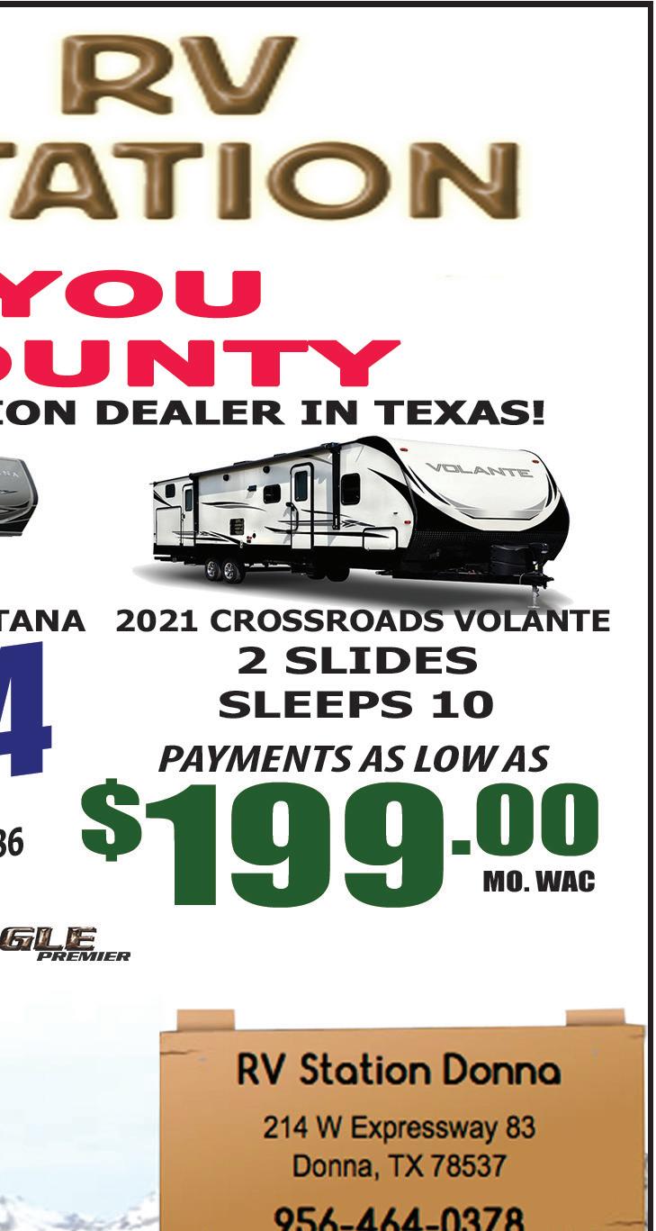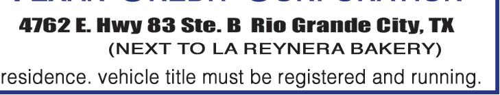 FLOWERS VESTIDOS MEXICANOS DISPONIBLES Sonita’s 1711 W. Main St., Rio Grande City (956) 256-8957 AL POR MAYOR ABIERTO AL PÚBLICO STARR COUNTY TOWN CRIER, DECEMBER 21, 2022, PAGE 10 Full Time Master Mechanic 3 yrs experience on diagnostics, suspension, fuel system, A/C repair. Submit resume to carcarefirst@ gmail.com or call 956-263-1862 NOW HIRING SE RENTA CASA 307 Papalote Rd., RGC Hernandez Rd. 3 RECAMARAS, 2 BAÑOS AIRE ACONDICIONADO Para mas información llame a: 956-435-4123 • 342-7669 Application has been made with the Texas Alcoholic Beverage Commission for a RETAIL DEALER’S OFF PREMISE LICENSE (BF), by: MIGUELITO’S INVESTMENTS, LLC dba MIKE’S DRIVE THRU, to be located at 100 HIDALGO AVE., RIO GRANDE CITY, STARR COUNTY, TEXAS. MANAGER OF SAID LLC: MIGUEL A LOPEZ. LEGAL NOTICE de 2 recamaras, 1 baño, estufa, refrigerador, aire central, cercada. Incluye agua y basura. En RGC SE RENTA CASA y UN APARTAMENTO 956-867-1099 STK#24348A 2020 Chevy Equinox LS People across the Valley come home to Rio Motor Co. for big savings and family-friendly service! No Matter Where You Live, Come Home! www.riomotors.com (956) 487-2596 · 1-800-509-0003 Rolando Flores 956-416-8945 Paco Cantu 956-208-1821 STK#24184A ONLY 16K MILES!!! LIKE NEW! NICE! 2021 Chevy Trail Blazer STK# 24588A 2016 Chevy Tahoe LS 2022 VW Jetta Passat STK# 24399C Like New! Like New! CERTIFIED MANAGER $PECIAL MANAGER $PECIAL STK# 24492A JUST ARRIVED 2021 GMC Yukon AT4 4X4 $32,995 JUSTARRIVED CALL CALL $23,905 $24,979