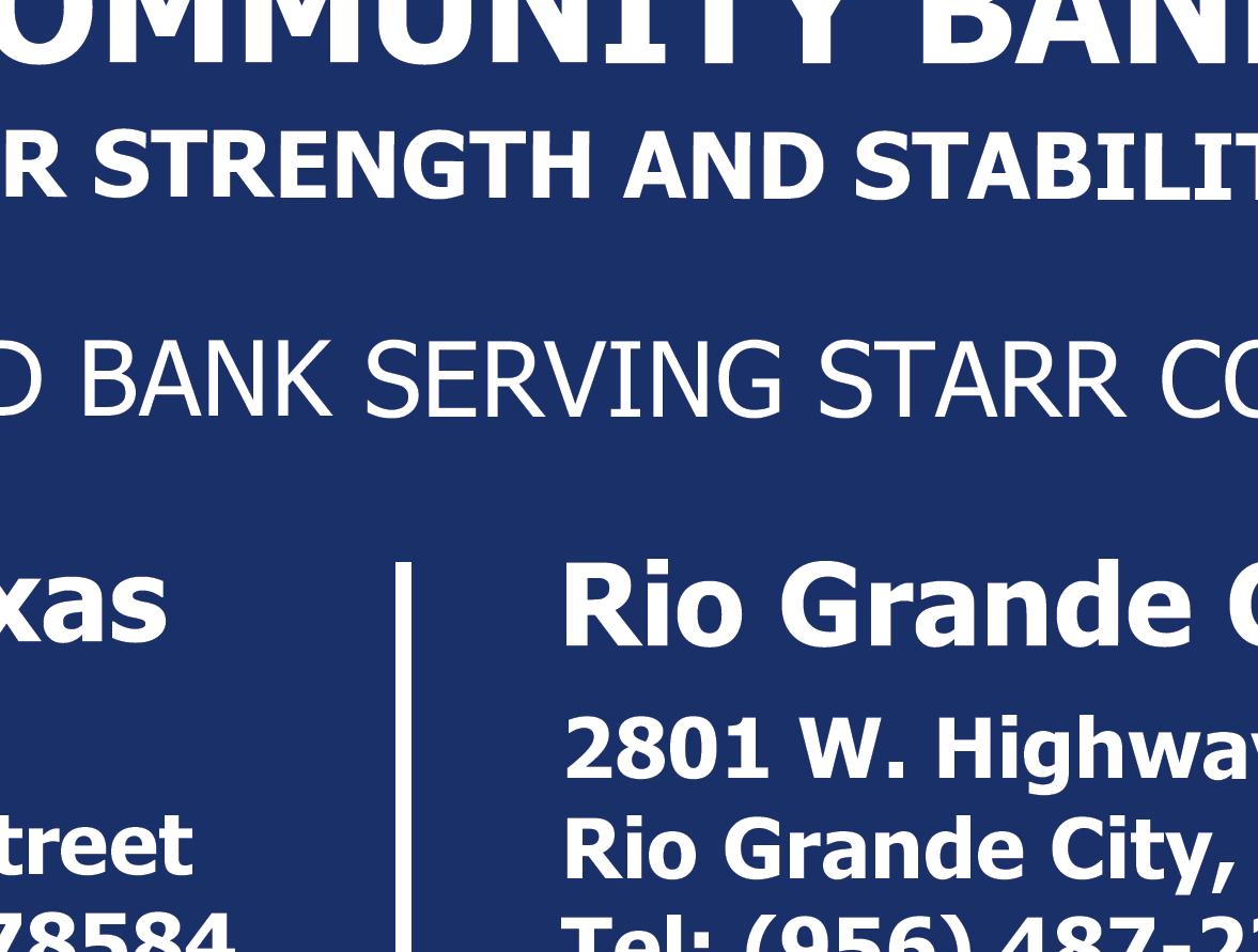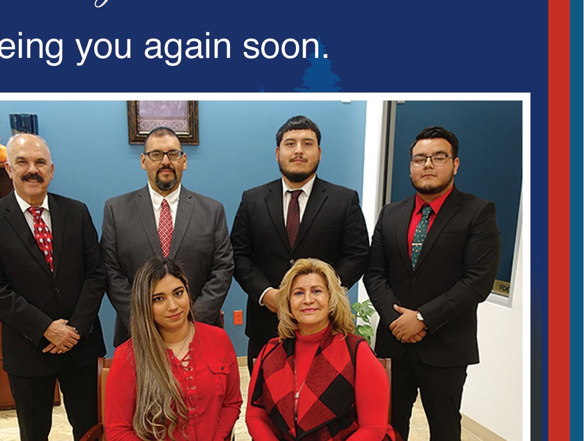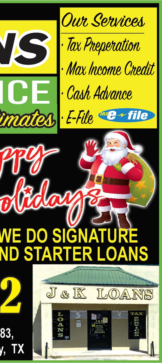 487-2440 300 East Main St. R.G.C. STARR VISION CENTER Dr. Angie Ramirez erapeutic Optometrist 488-0808 280 W. 2nd St. R.G.C. CASTAÑEDA Auto Insurance & Bail Bonds 487-7000 487-2596 4350 E. US HWY 83 R.G.C. • Individual • Partnership • Corporations • LLC’s • Bookkeeping • Payroll • Financial Statements • Form 2290 • IRS Audit Representation Mario A. Méndez, EA Licensed to practice before the IRS (Internal Revenue Service) 317-1124 (956) 201 S. San Antonio. St. Rio Grande City, TX (NEW LOCATION) Vol. 37, No. 51 WEEKLY WEDNESDAY • DECEMBER 21, 2022 Office (956) 487-6544 - Fax (956) 487-6165 - E-Mail: sctc78582@aol.com - www.starrcountytowncrier.com OPEN MON-SUN 7AM-7PM 956-487-2140 5470 E. HWY 83 R.G.C. TX 956-519-3237 • 6601 W. HWY 83 - MISSION, TX BIG DOOR SALE LARGE SELECTION WE HAVE A NEW LINE OF DOORS AVAILABLE The Law Office Of 956-317-1167 206 N. Britton Ave. Ste.B, R.G.C. jmchemagarza@gmail.com J.M. “Chema” Garza Criminal Cases (Federal/State) Car Accidents/ 18 Wheeler Divorces • Real Estate/Deeds Dr. Raymond Cruz Best FAMILY & COSMETIC DENTISTRY Dental Insurance, Medicaid and Chip Accepted 419 East 2nd St. Rio Grande City, Tx. 487-2999 311 E Main St Rio Grande City TX 78582-4448 Phone (956) 487-3925 Installment Loans J.M. “Chuy” Alvarez CHUY Alvarez 501 N. Britton Ave • Rio Grande City, Texas 956-487-4871 Cell: 956-208-0282 NOT CERTIFIED BY THE TEXAS BOARD OF LEGAL SPECIALIZATION ATTORNEY AT LAW Great turnout at the Toy Drive, which was sponsored by Calaveras M.C. and Grulla CV-CC. Citizens like you that allow our community to show how much holiday spirit we have! Please Go into Grulla Cv-cc page to view the rest of the pictures Calaveras