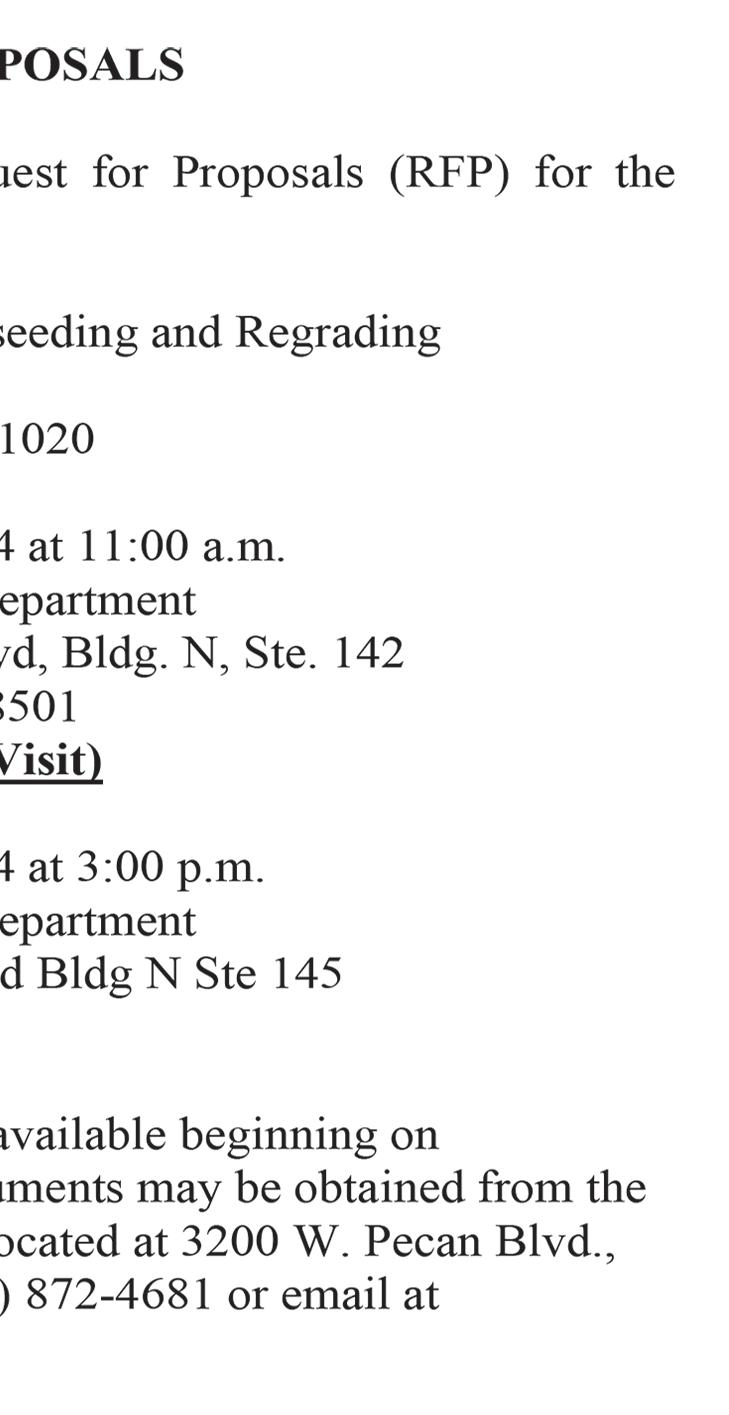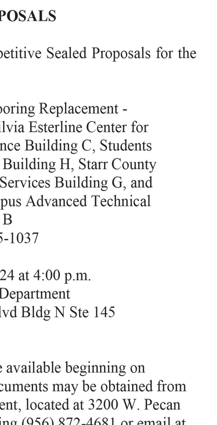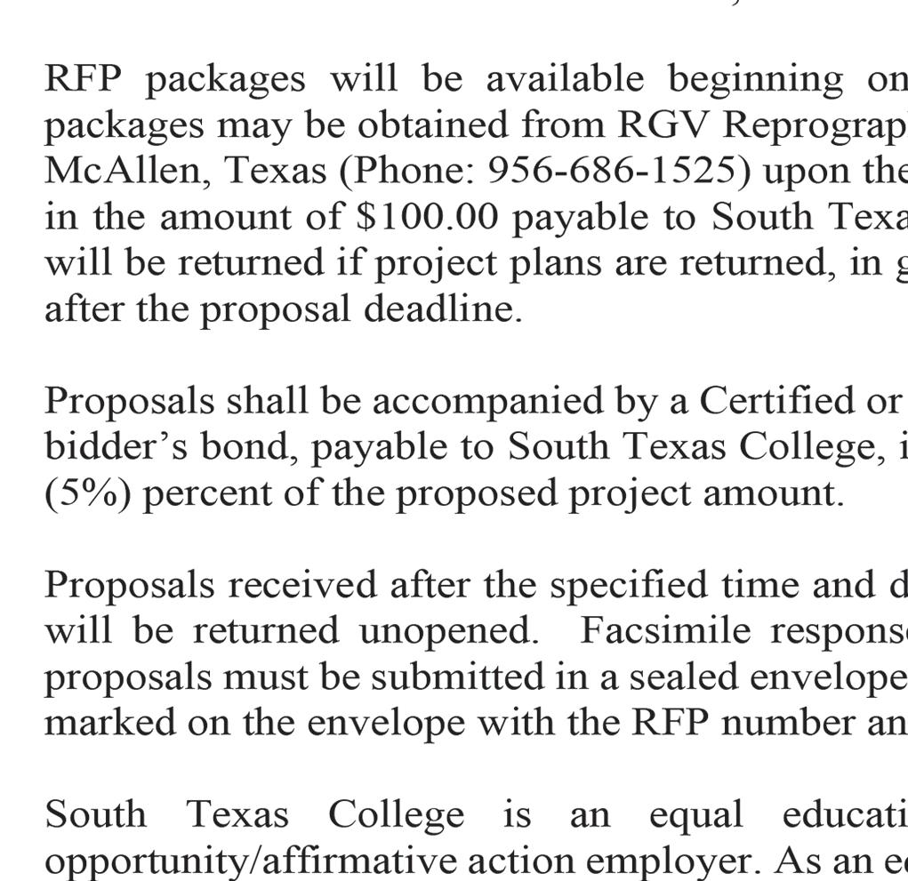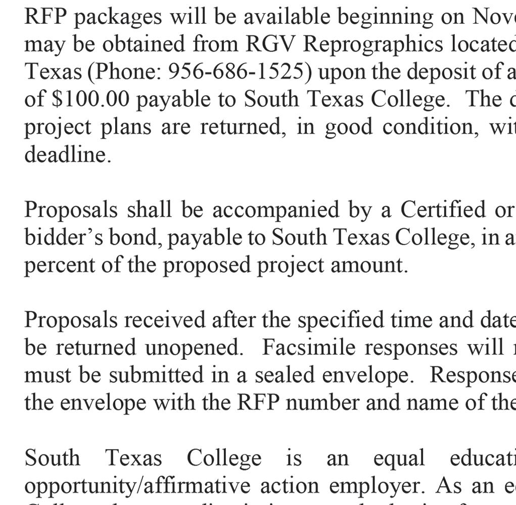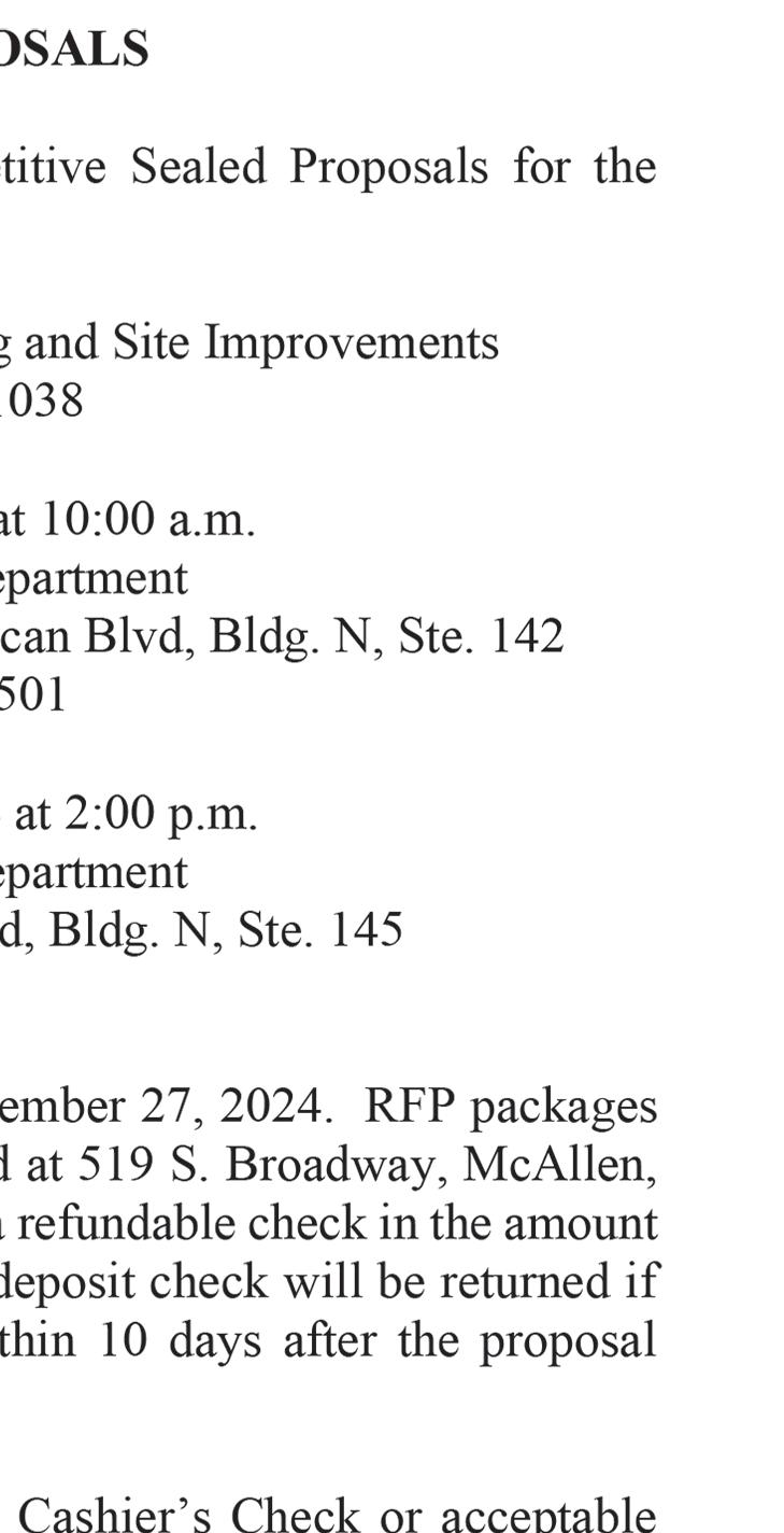 3200 W. Pecan Blvd, Bldg N, Ste 145, McAllen, TX 78501 (Corner of Quince & 31st Street) or by calling 956-872-4681. Responses received after the specified time and date will not be considered and will be returned unopened. Facsimile responses will not be accepted. All responses must be submitted in a sealed envelope. Responses need to be clearly marked on the envelope with the RFP number.