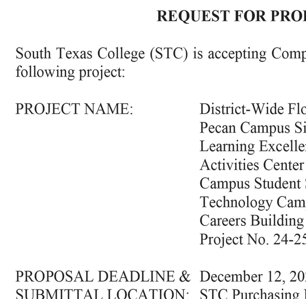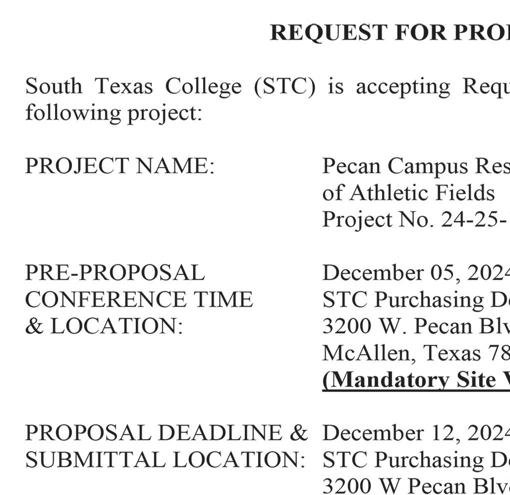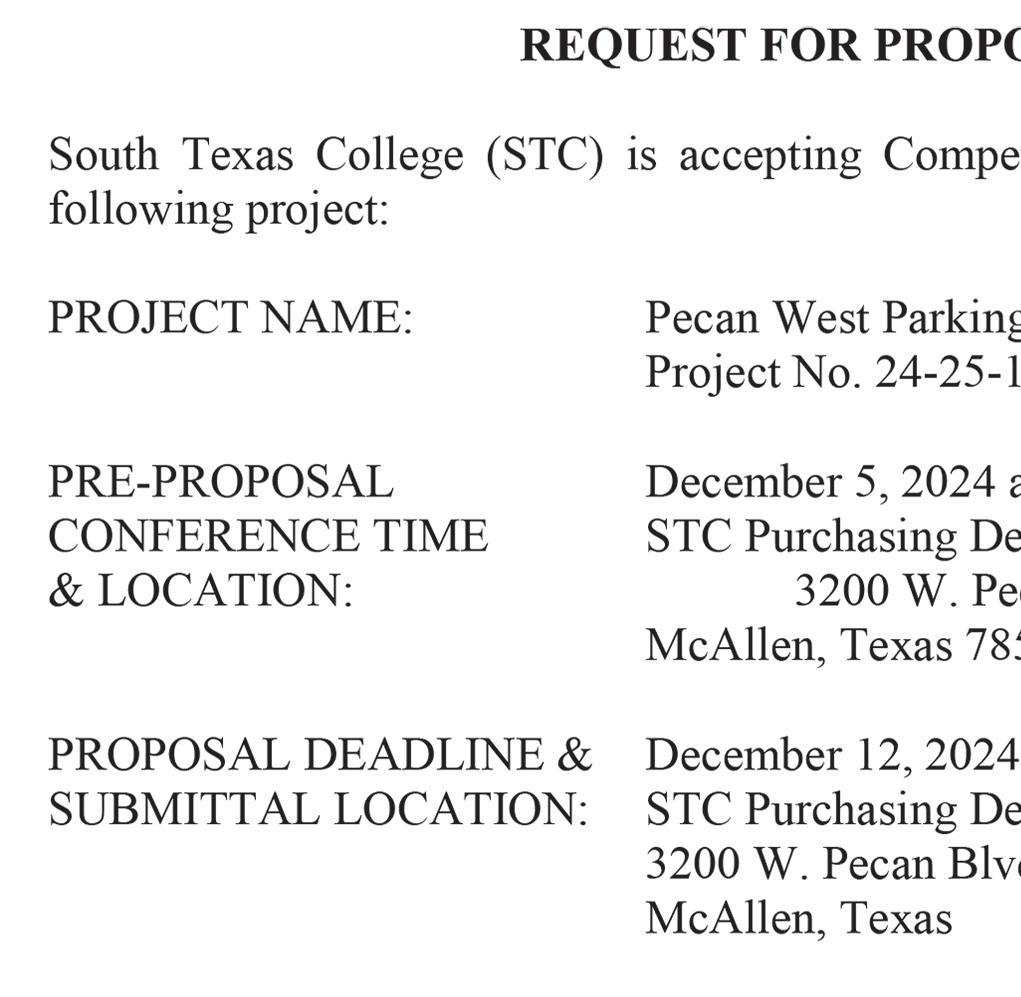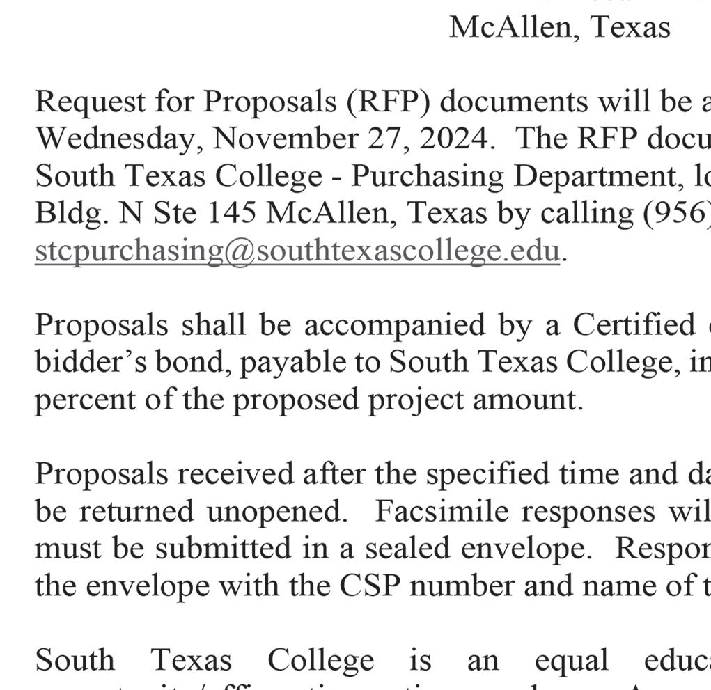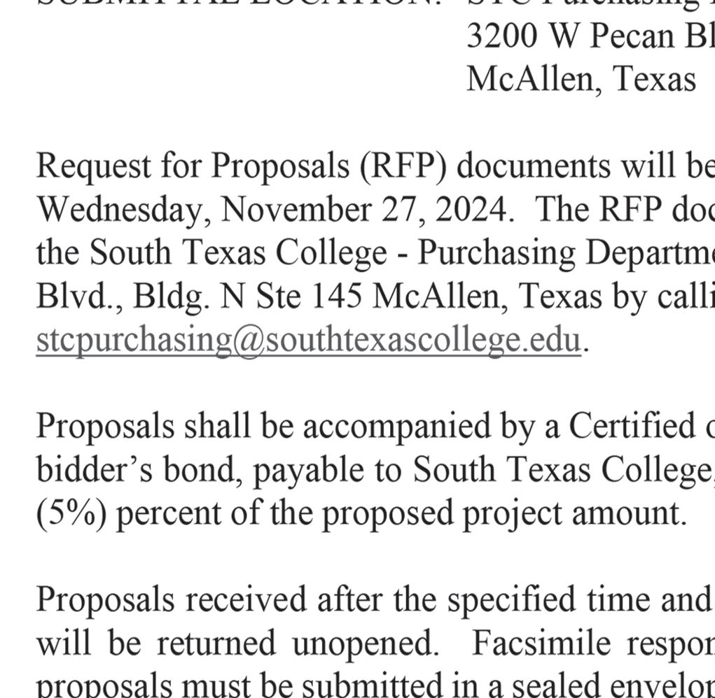 Questions regarding this RFP or requests for additional information should be addressed to Deyadira Leal, Director of Purchasing 956-872-4681 daleal@southtexascollege.edu, or Billy Langley, Senior Buyer, 956-872-4682 welangle@southtexascollege.edu. Responses to the RFP must be submitted to South Texas College, 3200 W. Pecan Blvd, Bldg N, Ste 145, McAllen, TX 78501.