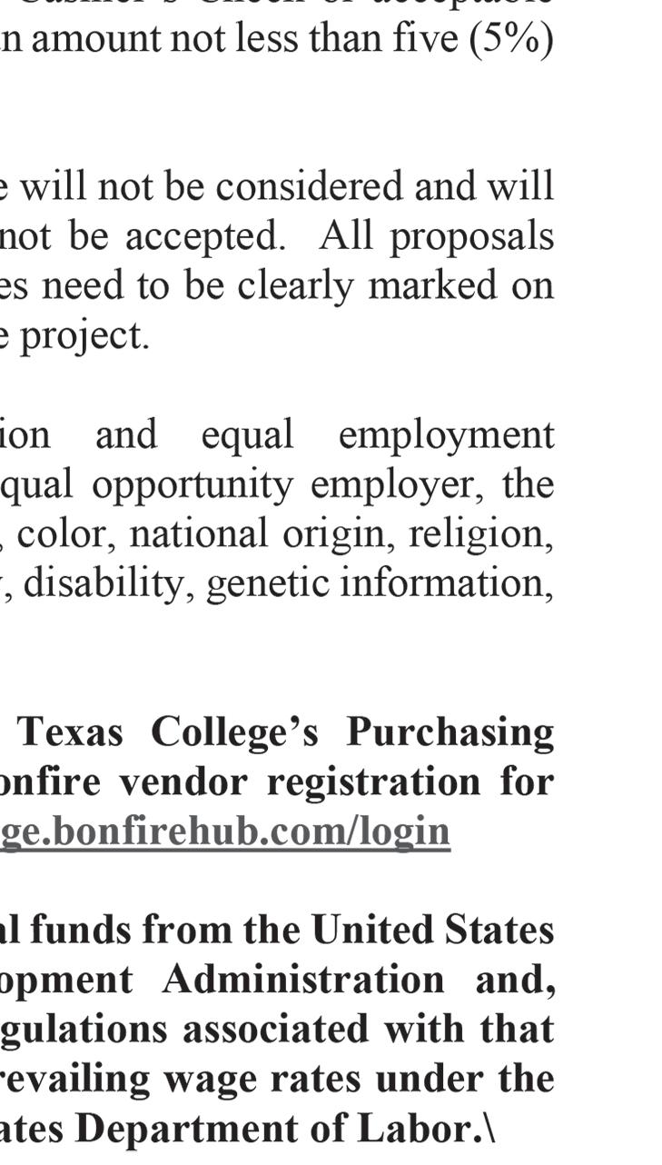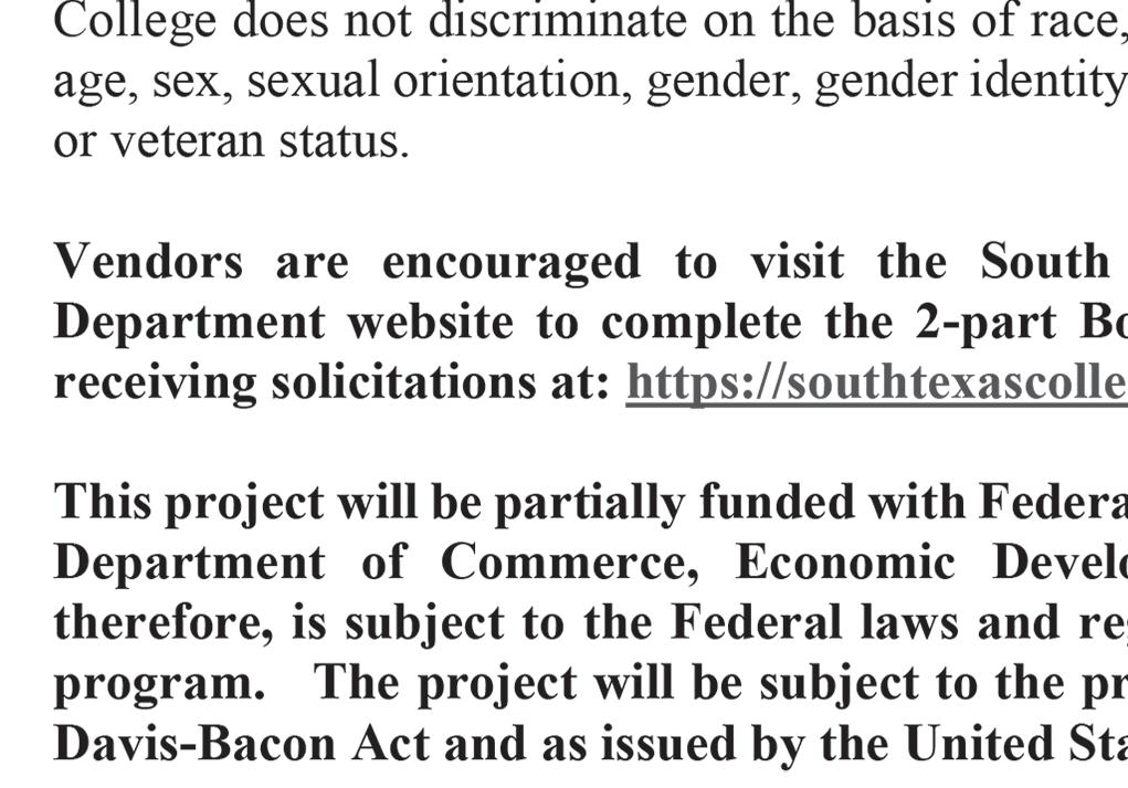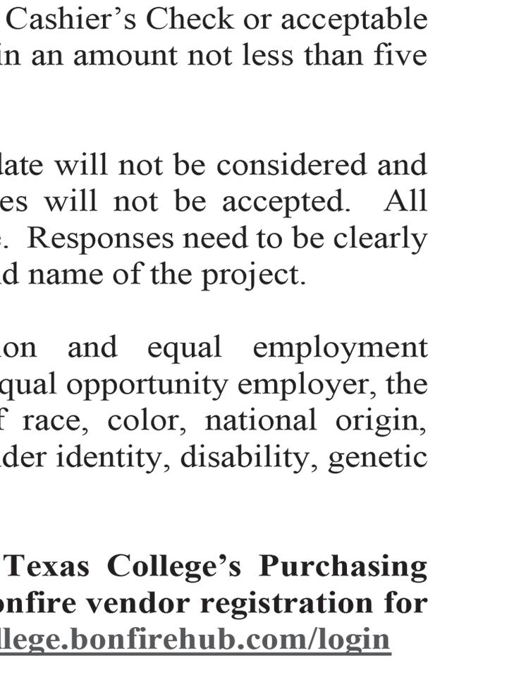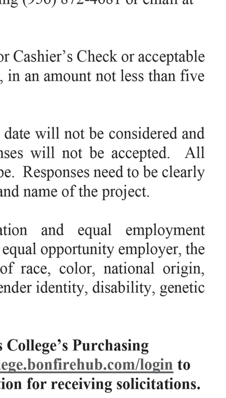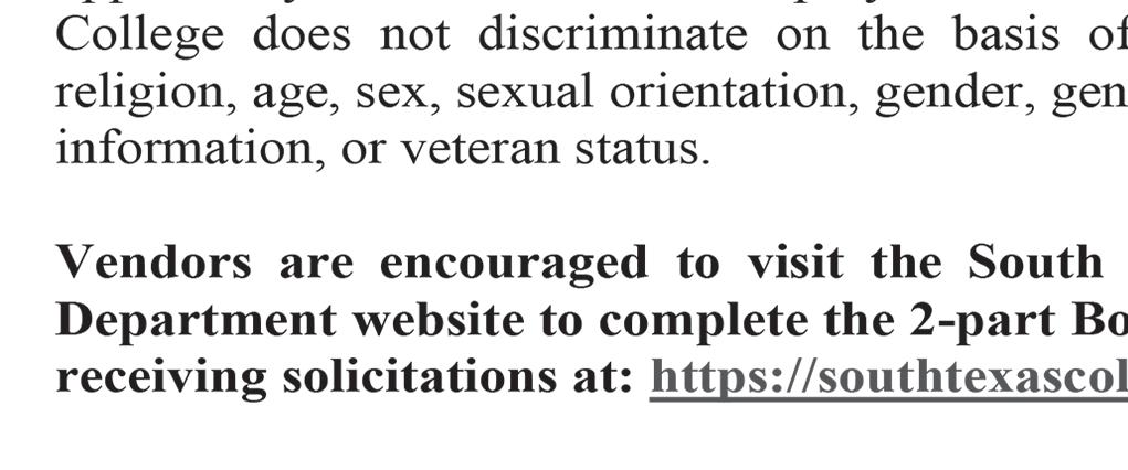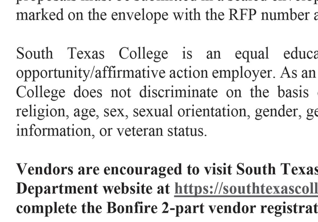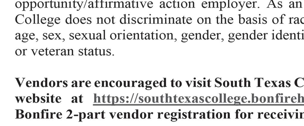 Vendors are encouraged to visit the South Texas College’s Purchasing Department website to complete the 2-part Bonfire vendor registration for receiving solicitations at: https://southtexascollege.bonfirehub.com/login