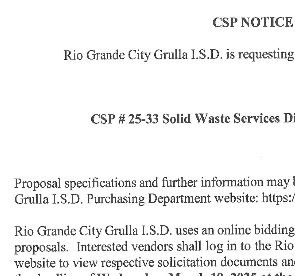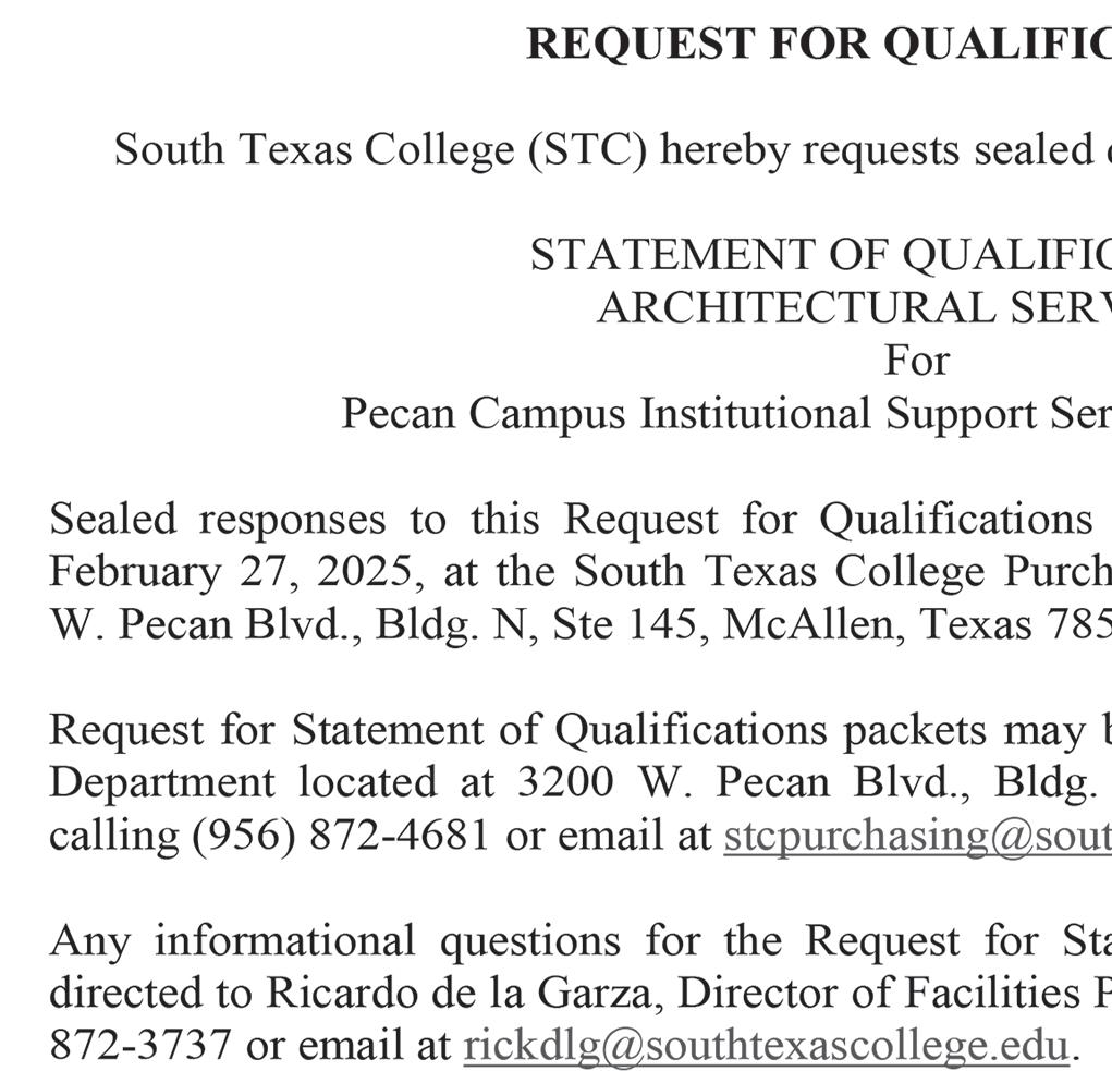Pre-Bid conference will be held at Starr County Courthouse Annex 100 N. F.M. 3167 Rio Grande City, Texas 78582 at 10:00 a.m. Thursday, February 20, 2025. All Perspective Bidders are encouraged to attend.