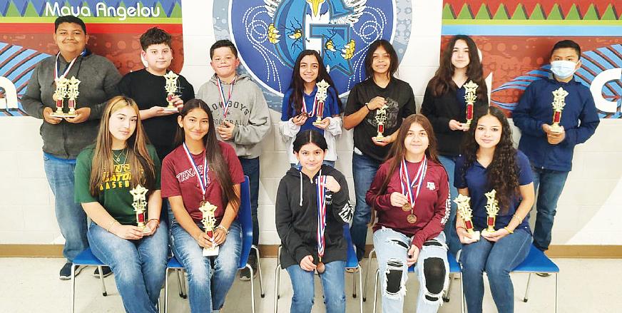 Congratulations to the Grulla Middle School Mighty Crane UIL participants who were awarded their long awaited medals and trophies!! All of them placed 1st through 6th at the District UIL Meet at Ramiro Barrera Middle School last month. Thank you for being patient while all this hardware was delivered to the GMS. Thank you to all the UIL parents for making the sacrifice on Saturdays to allow their son and daughters to participate at the UIL meets. Keep up the great work!