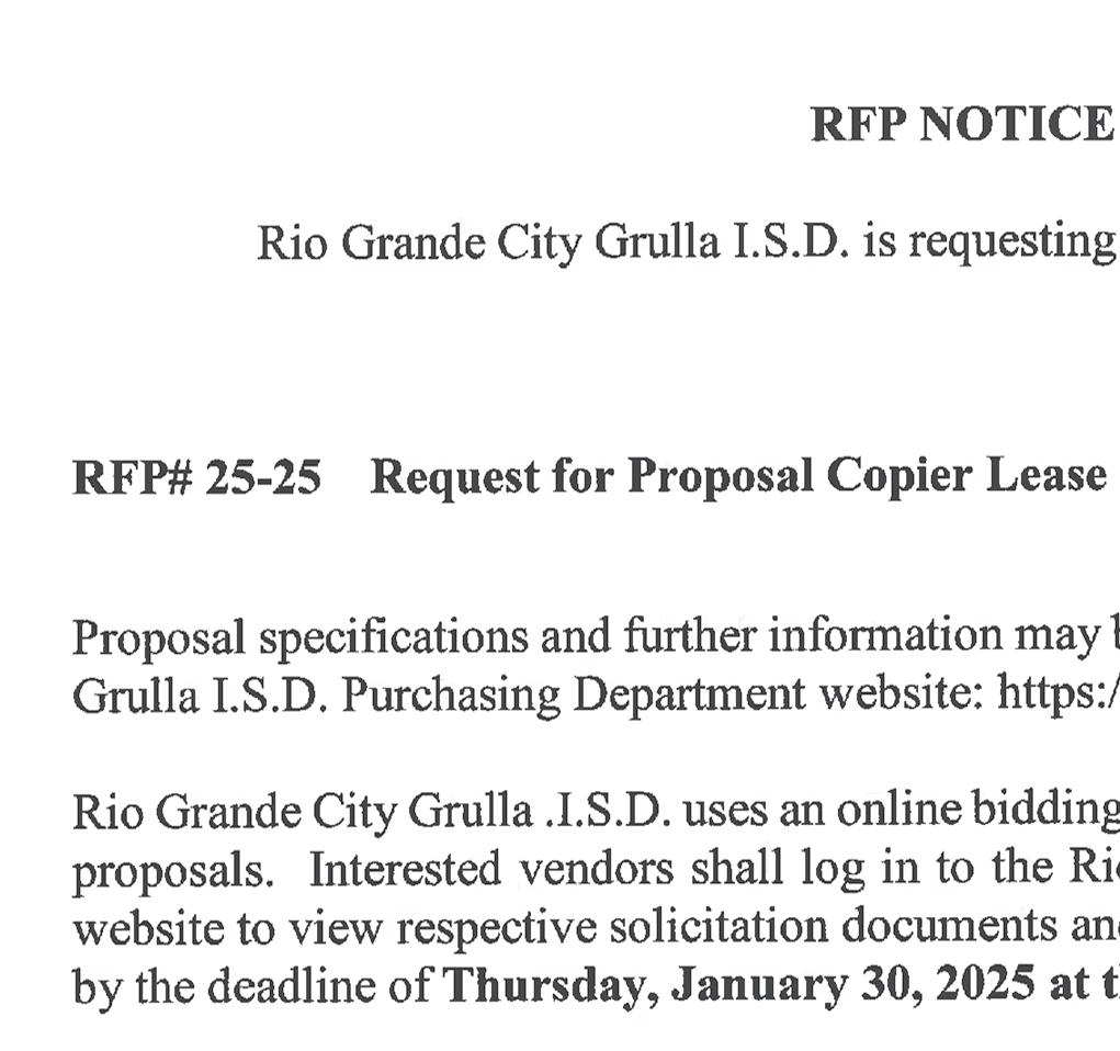 The City of Rio Grande City is soliciting sealed Request for Qualifications (RFQ) for Agent of Record. Sealed bids are to be addressed to the City Secretary’s Office located at the City of Rio Grande City – City Hall: 5332 E. US Hwy 83, Rio Grande City, Texas. RFQ’s will be received until 3:00 p.m. on Friday, January 24, 2025.
