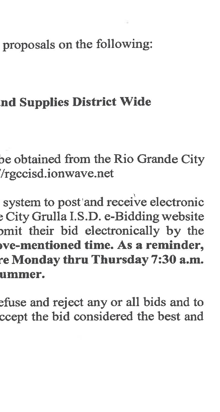 The San Isidro l.S.D. will be accepting proposals for Propane, Gasoline, and Diesel Fuel. Proposals must be in the Business O ce, 5175 FM 1017, San Isidro, Texas 78588 by 2:00pm on August 5, 2024 for further information contact Mr. Leonel Olivarez at (956)481-3100.