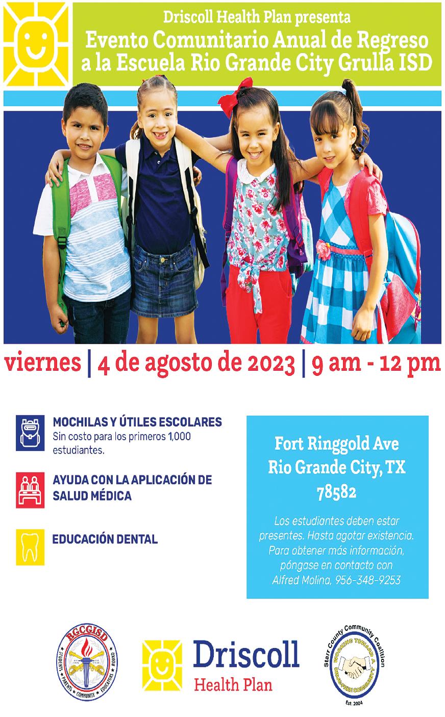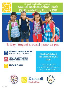 The Driscoll Health Plan donated 1,000 backpacks to RGCGISD students! This drive-through event will take place on August 4, 2023, at Fort Ringgold from 9:00 AM to 12:00 PM (until supplies last). The kids