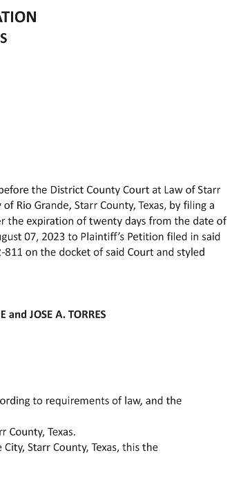 487-2440 300 East Main St. R.G.C. STARR VISION CENTER Dr. Angie Ramirez erapeutic Optometrist 488-0808 280 W. 2nd St. R.G.C. CASTAÑEDA Auto Insurance & Bail Bonds 487-7000 487-2596 4350 E. US HWY 83 R.G.C. • Individual • Partnership • Corporations • LLC’s • Bookkeeping • Payroll • Financial Statements • Form 2290 • IRS Audit Representation Mario A. Méndez, EA Licensed to practice before the IRS (Internal Revenue Service) 317-1124 (956) 201 S. San Antonio. St. Rio Grande City, TX (NEW LOCATION) Vol. 38, No. 30 WEEKLY WEDNESDAY • JULY 26, 2023 Office (956) 487-6544 - Fax (956) 487-6165 - E-Mail: sctc78582@aol.com - www.starrcountytowncrier.com The Law Office Of 956-317-1167 206 N. Britton Ave. Ste.B, R.G.C. jmchemagarza@gmail.com J.M. “Chema” Garza Criminal Cases (Federal/State) Car Accidents/ 18 Wheeler Divorces • Real Estate/Deeds Dr. Raymond Cruz Best FAMILY & COSMETIC DENTISTRY Dental Insurance, Medicaid and Chip Accepted 419 East 2nd St. Rio Grande City, Tx. 487-2999 J.M. “Chuy” Alvarez CHUY Alvarez 501 N. Britton Ave • Rio Grande City, Texas 956-487-4871 Cell: 956-208-0282 NOT CERTIFIED BY THE TEXAS BOARD OF LEGAL SPECIALIZATION ATTORNEY AT LAW 668 E. Grant St. Ste A&B Roma TX 78584-5312 Phone (956) 849-4497 Installment Loans SPACE AVAILABLE CALL 956-487-6544