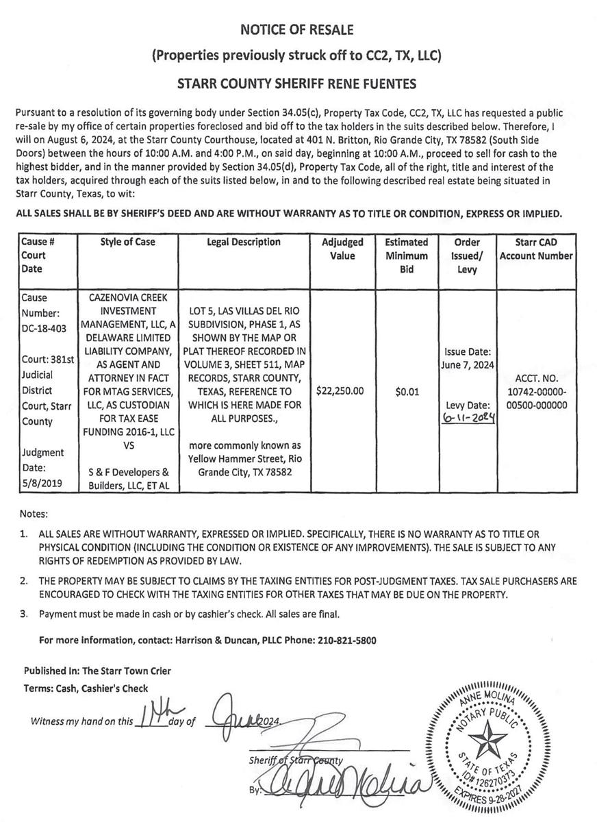 Pursuant to a resolution by Commissioners Court, Starr County, as authorized by Section 34.05(c), Property Tax Code, has requested a public re-sale by my office of certain properties previously foreclosed and bid off to the taxing units in the suits described below. Therefore, I will on August 06, 2024, at the South Side Doors of the Courthouse, of the said County, located at 401 N. Britton, Rio Grande City, Texas, between the hours of 10:00 A.M. and 4:00 P.M. on said day, beginning at 10:30 A.M., proceed to sell for cash to the highest bidder, and in the manner provided by Section 34.05(d), Property Tax Code, all of the right, title and interest of the taxing units, acquired through each of the suits listed below, in and to the following described real estate being situated in Starr County, Texas, to wit:
