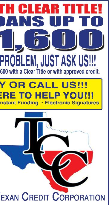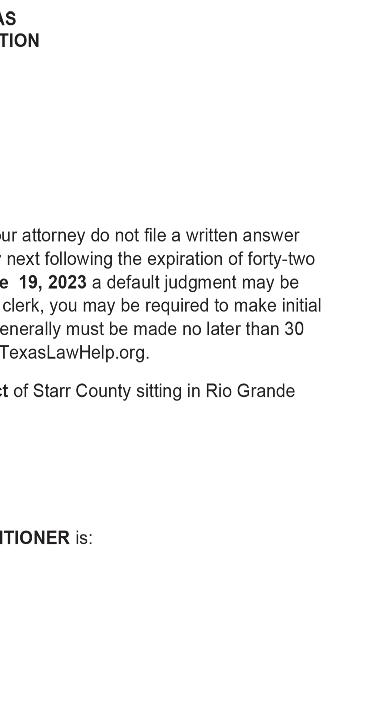 STARR COUNTY TOWN CRIER, JUNE 21, 2023, PAGE 6 APARTMENT FOR RENT 1 bedroom, 1 bath w/ laundry, dinning, and living room appliances included. Newly remodeled 1 block away from North Grammar Elementary in RGC. For info. call 956-487-8989 NOTICE OF PUBLIC AUCTION - JUNE 24, 2023 Property to satisfy Landlord’s lien. Sale is on Saturday, JUNE 24, 2023 at 10:00 A.M. Super Starr Storage, 215 North F.M. 3167, Rio Grande City Texas 78582. Property will be sold to the highest bidder for cash only. Cleanup and removal deposit may be required. Seller reserves right to not accept any bid and to withdraw property from sale. Property unknown until day of the sale. Property includes contents of spaces of the following tenants: Shallom Gonzalez and Ramon Garcia RGC Fire Department & Emergency Management Special Weather Statement-If spending time outdoors, stay hydrated, wear light weight and light colored clothing, and take frequent breaks from heat. -Stay informed and alert about weather conditions. STK#24902C 2020 Ford Edge ST People across the Valley come home to Rio Motor Co. for big savings and family-friendly service! No Matter Where You Live, Come Home! www.riomotors.com (956) 487-2596 · 1-800-509-0003 Rolando Flores 956-416-8945 Paco Cantu 956-208-1821 STK# 24757A ONLY 16K MILES!!! NICE! 2020 Chevy Blazer STK# P2444 2022 Chrysler 300 2021 GMC Yukon Denali STK#24853A MANAGER $PECIAL MANAGER $PECIAL STK# P2445 JUST ARRIVED JUSTARRIVED $59,988 CALL 2022 Chevy Silverado RST $33,995 $33,495 $35,995 $35,995 $35,995 $38,995 4X4 DIESEL