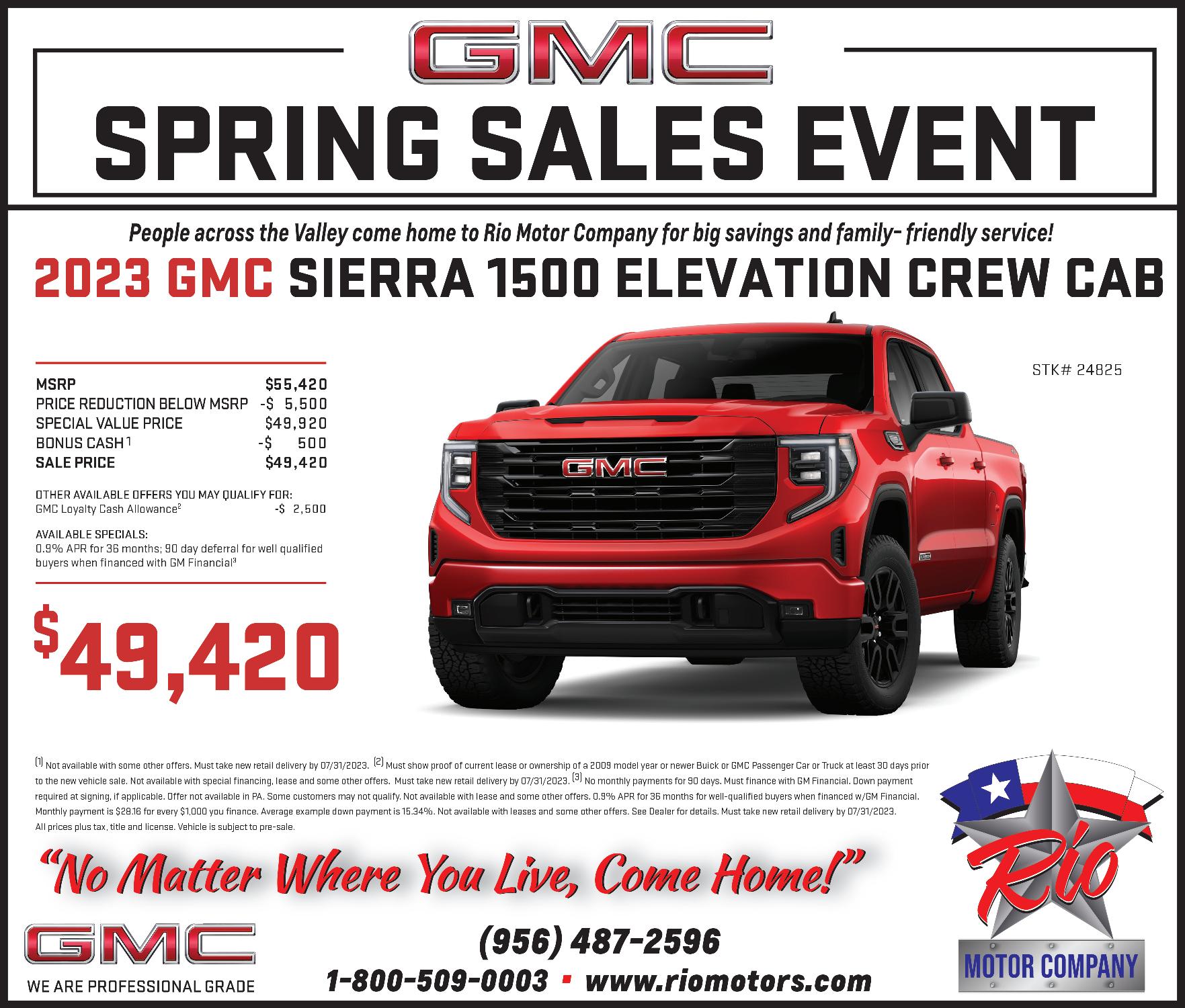 STARR COUNTY TOWN CRIER, JUNE 21, 2023, PAGE 7 (956) 487-2596 1-800-509-0003 www.riomotors.com “No Matter Where You Live, Come Home!” “No Matter Where You Live, Come Home!” People across the Valley come home to Rio Motor Company! STK# 24608 2023 CHEVROLET SILVERADO 1500 CREW CAB CUSTOM 4WD MSRP $51,050 PRICE REDUCTION BELOW MSRP -$ 3,305 SPECIAL VALUE PRICE $47,745 CUSTOMER CASH 1 -$ 1,750 BONUS CASH 2 -$ 1,000 SALE PRICE $44,995 OTHER AVAILABLE OFFERS YOU MAY QUALIFY FOR: GM Trade Allowance 3 -$ 1,500 AVAILABLE SPECIALS: 1.9% APR For 36 Months; 90 Day Deferral For Well Qualified Buyers When Financed w/GM Financial 4 $44,995 (1) Not available with special financing, lease and some other offers. Must take new retail delivery by 07/31/2023. (2) Not available with lease and some other offers. Residential restrictions apply. Must take new retail delivery by 07/31/2023. All prices plus tax, title and license. Vehicle is subject to pre-sale. (3) Must trade in a 2009 model