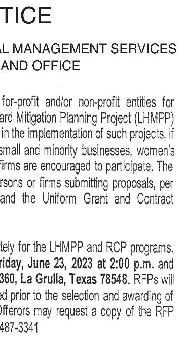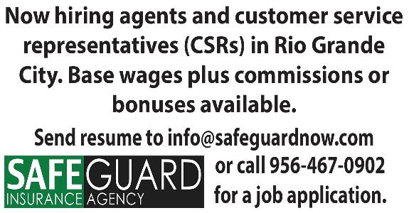 ¿Necesitas ayuda de PROVIDER en tu casa, o conoces a alguien que necesita PROVIDER? HABLEME: OMAR REYES (956) 533-9001 CONSULTA GRATIS Pero, tienen miedo a pedir por temor de perder su propiedad. Sabias que existen cosas a su favor para que eso no suceda. JUNE 21, 2023 PAGE 8 Your local source for Medicare. Yesenia Lopez Licensed Sales Agent 956-370-0070 TT Y 711 Arroyo:5065 Hwy. 83 ste. A - 956-570-0702 RGC: 4370 E. Hwy 83 Ste. B - 956-309-3549 NOW OPEN NOW OPEN Roma: 834 E. Grant St. Ste. C - 956-570-0701 Escobares: 4522 East Hwy 83 Ste A. 956-429-5625 Penitas - 1715 Expressway 83 Suite A-2 Penitas Tx- 956-424-0133 103 W. 2nd Street Rio Grande City, Tx 78582 956-488-0160 You’re in good hands. Auto • Home • Business • Life Hablamos Español SPACE AVAILABLE PLEASE CALL 956-487-6544