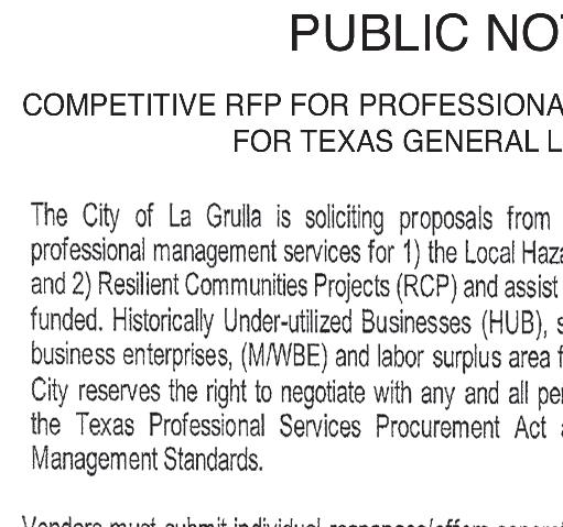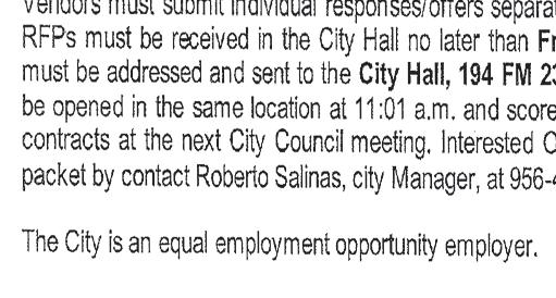The San Isidro l.S.D. will be accepting proposals for Propane, Gasoline, and Diesel Fuel. Proposals must be in the Business O ce, 5175 FM 1017, San Isidro, Texas 78588 by 2:00pm on July 10, 2023 for further information contact Mr. Leonel Olivarez at (956)481-3100.