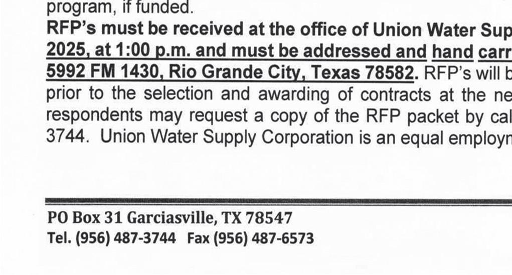 Bids will be received until 3:00 P.M. on Wednesday, April 2, 2025. Shortly after, all submitted bids will be gathered and taken to the City Hall Chambers Room to be publicly opened and read aloud. Any bid received after closing time will be rejected and returned to the bidder unopened. The sealed envelope shall be marked with the following on the lower left-hand corner: “CITY RIO GRANDE CITY – NORTH LOPEZ SANITARY SEWER COLLECTION”.