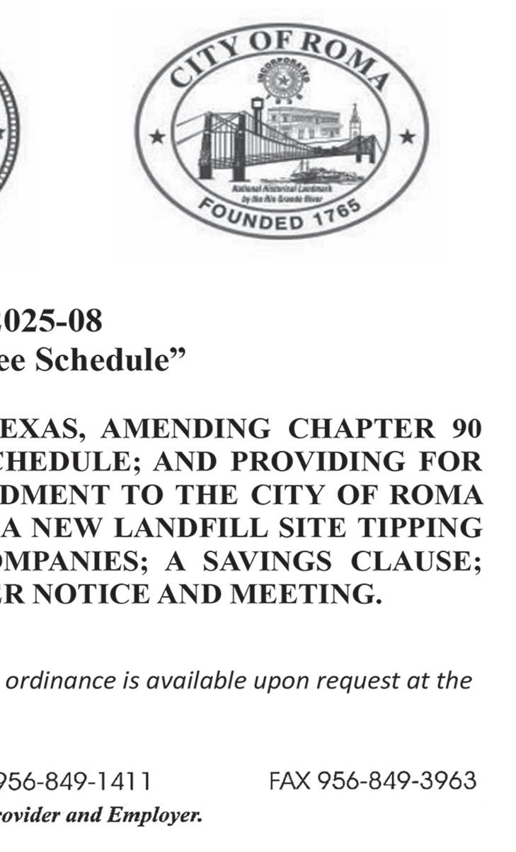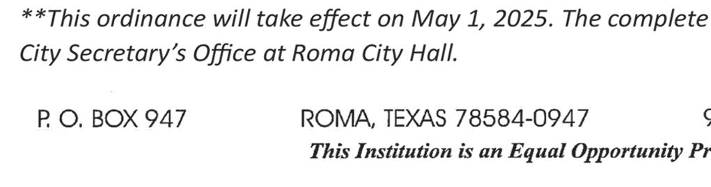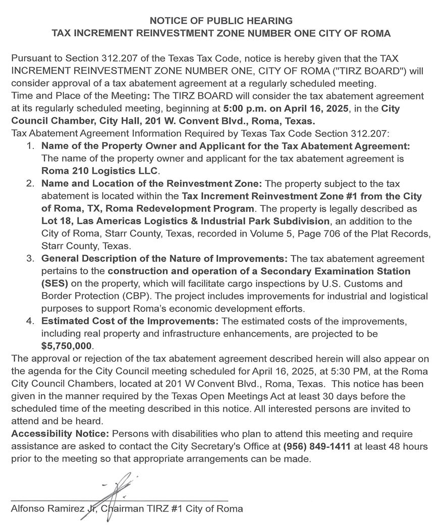 The City Council for the City of Roma will be holding a Public Hearing for the case(s) on Wednesday, April 9, 2025, at 5:30 p.m., at the Roma City Council Chambers, located at 201 W. Convent Ave., Roma, Texas.