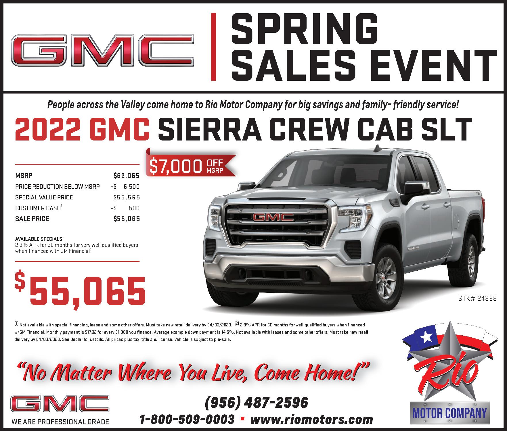 STARR COUNTY TOWN CRIER, MARCH 22, 2023, PAGE 11 (956) 487-2596 1-800-509-0003 www.riomotors.com “No Matter Where You Live, Come Home!” “No Matter Where You Live, Come Home!” People across the Valley come home to Rio Motor Company! MSRP $50,260 PRICE REDUCTION BELOW MSRP -$ 3,515 SPECIAL VALUE PRICE $46,745 CUSTOMER CASH 1 -$ 1,750 BONUS CASH 2 -$ 1,000 SELECT MARKET BONUS CASH 3 -$ 1,000 SALE PRICE $ 42,995 L 2022 CHEVROLET SILVERADO CREW CAB LT $42,995 K# 24622 AVAILABLE SPECIALS: 0% APR for 48 months for very well qualified buyers when financed with GM Financial 4 L (1) Not available with special financing, lease and some other offers. Must take new retail delivery by 04/03/2023. (2) Not available with lease and some other offers. Must take new retail delivery by 04/03/2023. (3) Not available with lease and some other offers. Residential restrictions apply. Must take new retail delivery by 04/03/2023. (4) 0% APR for 48 months for well-qualified buyers when financed w/GM Financial. Monthly payment is $20.83 for every $1,000 you finance. Average example down payment is 13.2%. Not available with leases and some other offers. Must take new retail delivery by 04/03/2023. See Dealer for details. All prices plus tax, title and license. Vehicle is subject to pre-sale.