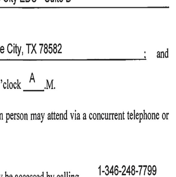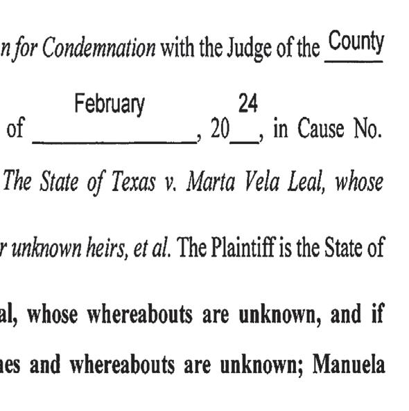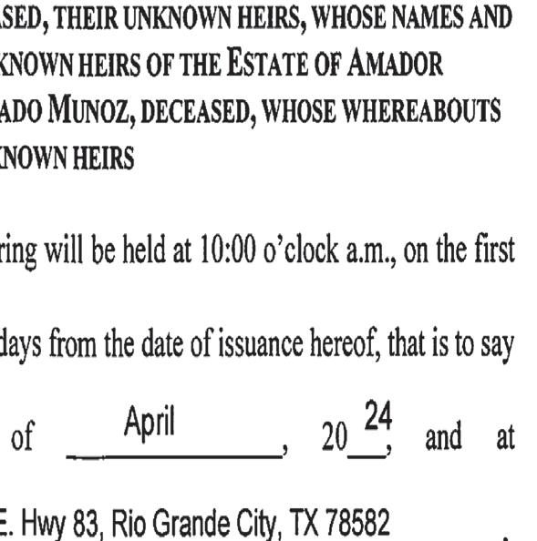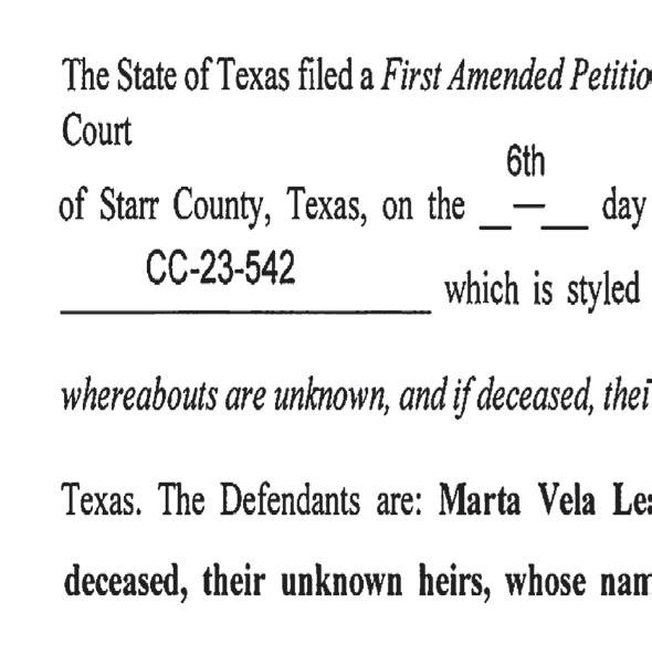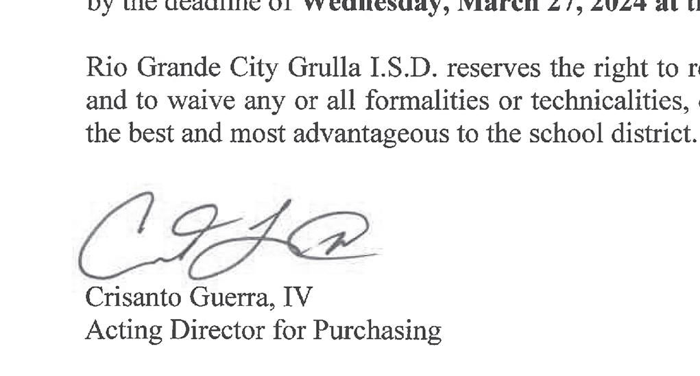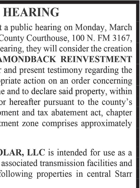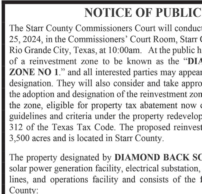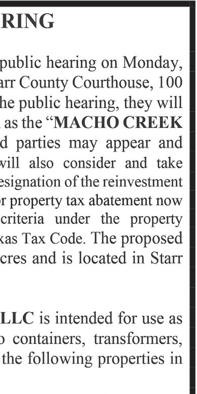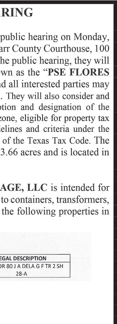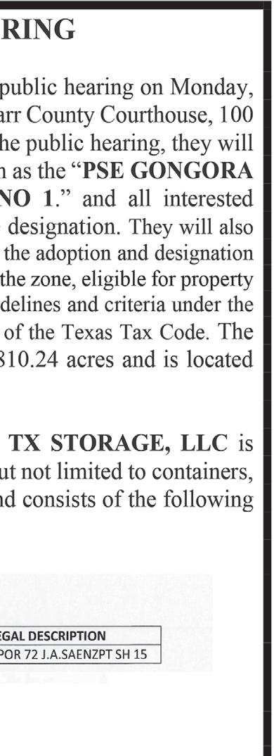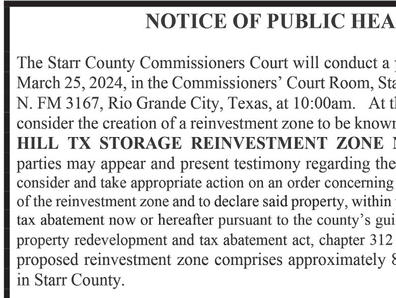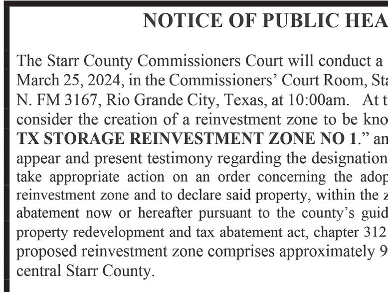 Procedure and Transportation Code 683, Subsection B, 683.012, of the Texas Department of Transportation that the County of Starr Sheriff ’s Office, Rio Grande City, Texas will hold a public auction on Saturday March 23rd, 2024, at 10:00 a.m. for General Surplus, Equipment and Vehicles which have been forfeited to the State of Texas under the provisions of Chapter 59 Texas Code of Criminal Procedure. Location: 2101 I-69C, Edinburg, TX 78542. Registration to bid will be from 8:00 a.m. to 10:00 a.m. and will require a picture identification. Examples of items to be auctioned are cars, trucks, heavy equipment, personal computers, electronics, office furniture, surplus, etc. All items will be sold “As Is - Where Is” to the highest bidder. Onsite Buyer’s Premium 14%. Internet Buyer’s Premium 16%. All sales are final and must be paid on the same day with cash, major credit cards (Visa, Master Card, Discover, American Express), Debit & Credit with a 3.99% processing fee. Checks accepted “day of auction” only with certain conditions. For additional information, please contact the County of Starr Sheriff ’s Office, at (956) 487-5571. AUC#17532 - Jose A. Camarillo