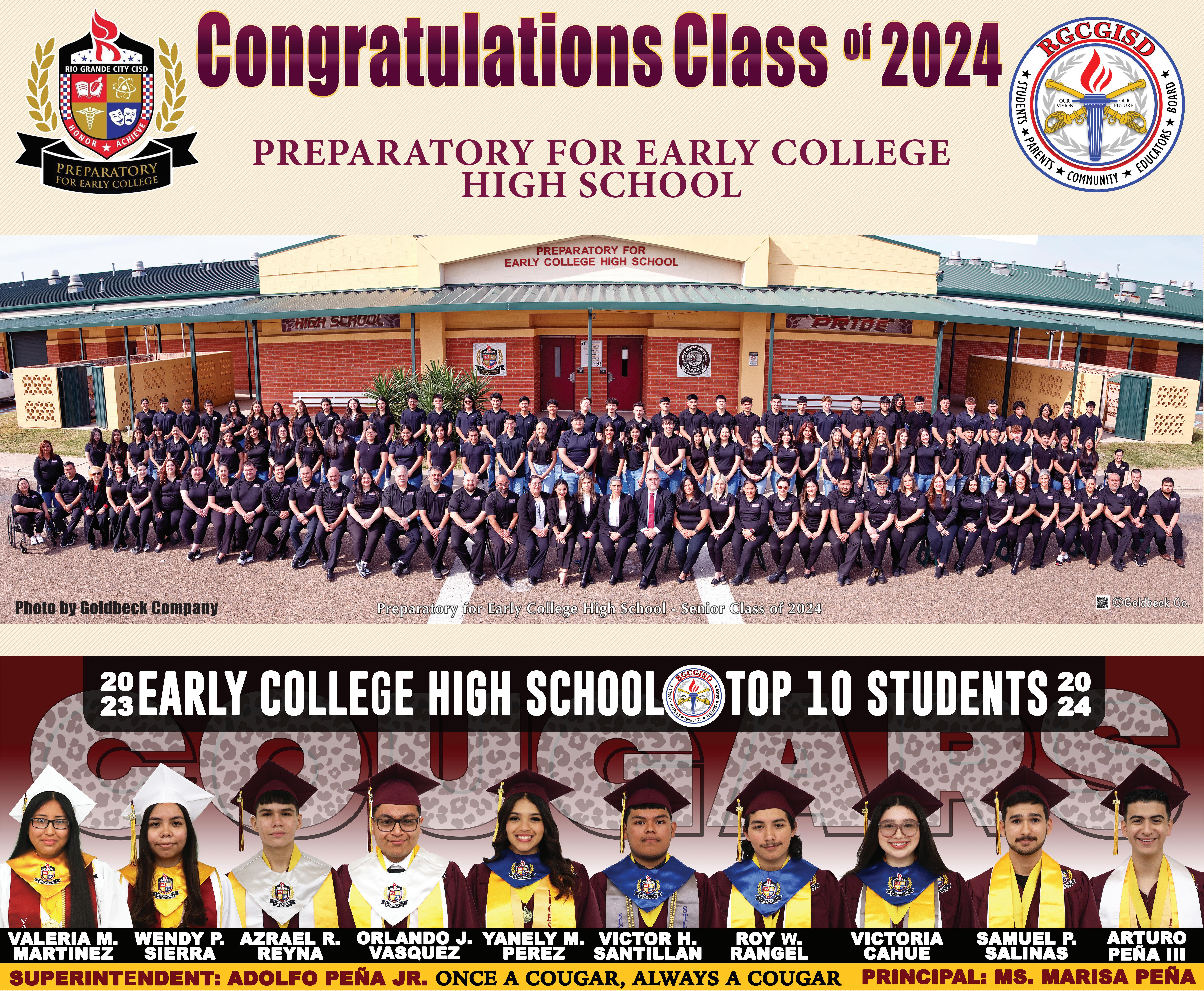 The Rio Grande City High School banquet was held on May 15, 2024 @ the RHS Main gym. Welcoming the students was RHS principal, Mrs. Maribel Montemayor and the Rio HS administrative staff. Also present was Mrs. Marissa Pena, Early College High School Principal and her