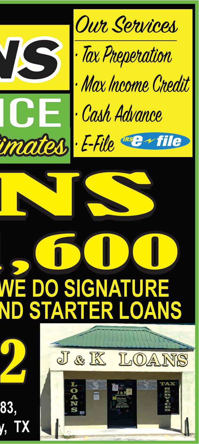 STARR COUNTY TOWN CRIER, MAY 29, 2024, PAGE 16 2022 Nissan Kicks S STK#25205A 2022 Chevy Blazer People across the Valley come home to Rio Motor Co. for big savings and family-friendly service! No Matter Where You Live, Come Home! www.riomotors.com (956) 487-2596 · 1-800-509-0003 Rolando Flores 956-416-8945 Paco Cantu 956-208-1821 STK#25683A ONLY 16K MILES!!! NICE! 2022 Jeep Compass STK#25813A 2023 Nissan Frontier Pro-4X STK#25498B MANAGER $PECIAL MANAGER $PECIAL STK#25755A MUST GO!! CALL $42,995$39,774 $29,777 $22,997 $24,990 $32,777 $25,998 $26,998 2022 GMC Sierra 1500 Limited APARTMENT FOR RENT 1 bedroom, 1 bath w/ laundry, dinning, and living room appliances included. Newly remodeled 1 block away from North Grammar Elementary in RGC. For info. call 956-487-8989 Application has been made with the Texas Alcoholic Beverage Commission for a WINE AND MALT BEVERAGE RETAILER’S OFFPREMISE PERMIT (BQ) by: JNJ’S GROCERIES LLC , dba JNJ’S GROCERIES LLC , to be located at 5751 E. US HWY 83, RIO GRANDE CITY, STARR COUNTY, TEXAS. Officer of said LLC: JORGE LUIS MORALES JR., OWNER/ MANAGER. LEGAL NOTICE “Help needed: - yard work - lawn care - trash disposal - general housework help 956-844-9303 FOR SALE Beautiful Australian shepherd puppies 3 males, 4 females Merle and tricolor available 6 weeks old. $350-$500 Call with questions