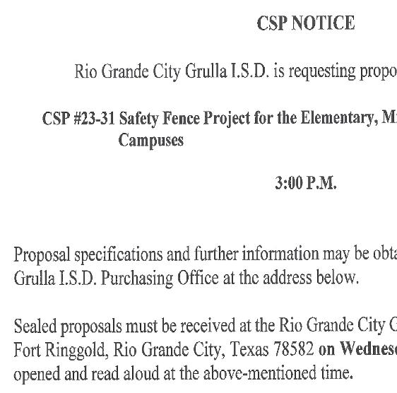 RFP/RFQs must be received in the City Hall no later than Friday, May 26, 2023 at 11:00 a.m. and must be addressed and sent to the City Hall, 194 FM 2360, La Grulla, Texas 78548. A pre-bid conference will be conducted on Wednesday, May 17, 2023 at 10:30 a.m. at the La Grulla City Hall. RFP/RFQs will be opened on May 26, 2023 at the same location at 11:01 a.m. and scored prior to the selection and awarding of contracts at the next City Council meeting. Interested Offerors may request a copy of the RFP/RFQ packet by calling City Hall at 956-343-3361 or e-mailing your request to b.salinas@cityofgrulla.com