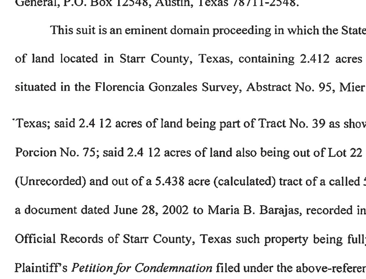42.80 feet by 115.00 feet, containing 0.1129 acre, more or less, situated in Porcion 78, D. Garcia Survey, Abstract 82, Starr County, Texas, as described in deed dated January 2, 1940, from Rosa Rangel Vda de Garcia to Sotero Lara, in Volume 116, Page 407, Deed Records of Starr County, Texas., with an adjudged value of $13,800.00