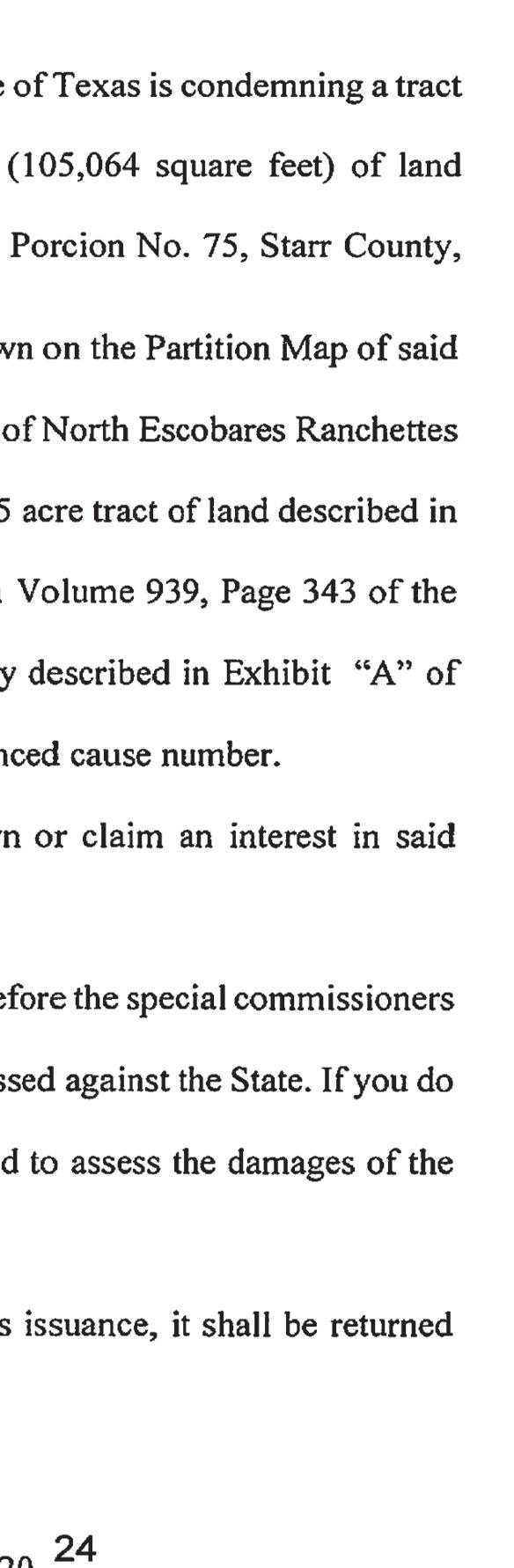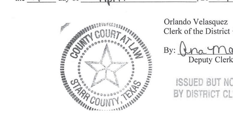 and issued pursuant to judgment decree(s) of the District Court of Starr County, Texas, by the Clerk of said Court on said date, in the hereinafter numbered and styled suit(s) and to me directed and delivered as Sheriff or Constable of said County, I have on May 3, 2024, seized, levied upon, and will, on the first Tuesday in June, 2024, the same being the 4th day of said month, at the South Side Doors of the Courthouse, of the said County, located at 401 N. Britton, Rio Grande City, Texas, between the hours of 10 o’clock a.m. and 4 o’clock p.m. on said day, beginning at 10:00 AM, proceed to sell for cash to the highest bidder all the right, title, and interest of the defendants in such suit(s) in and to the following described real estate levied upon as the property of said defendants, the same lying and being situated in the County of Starr and the State of Texas, to-wit: