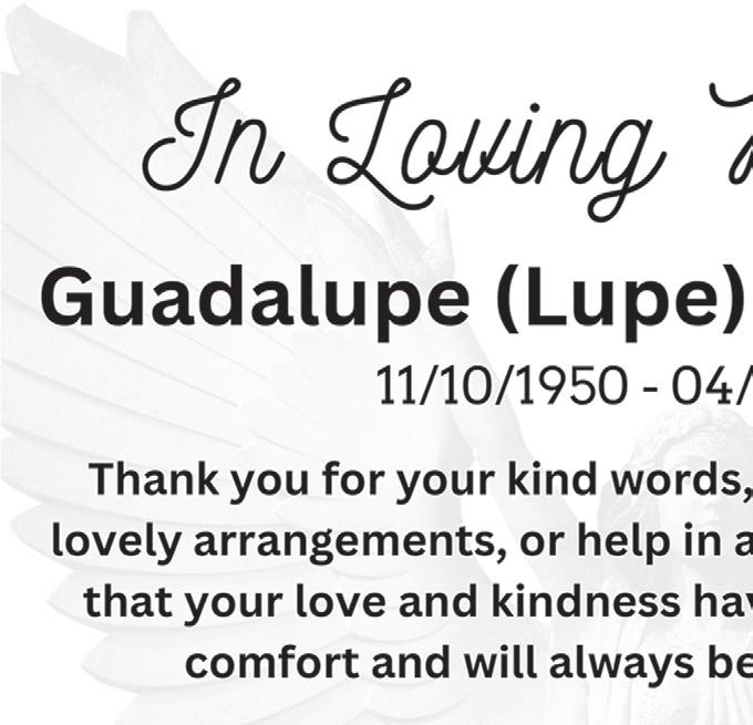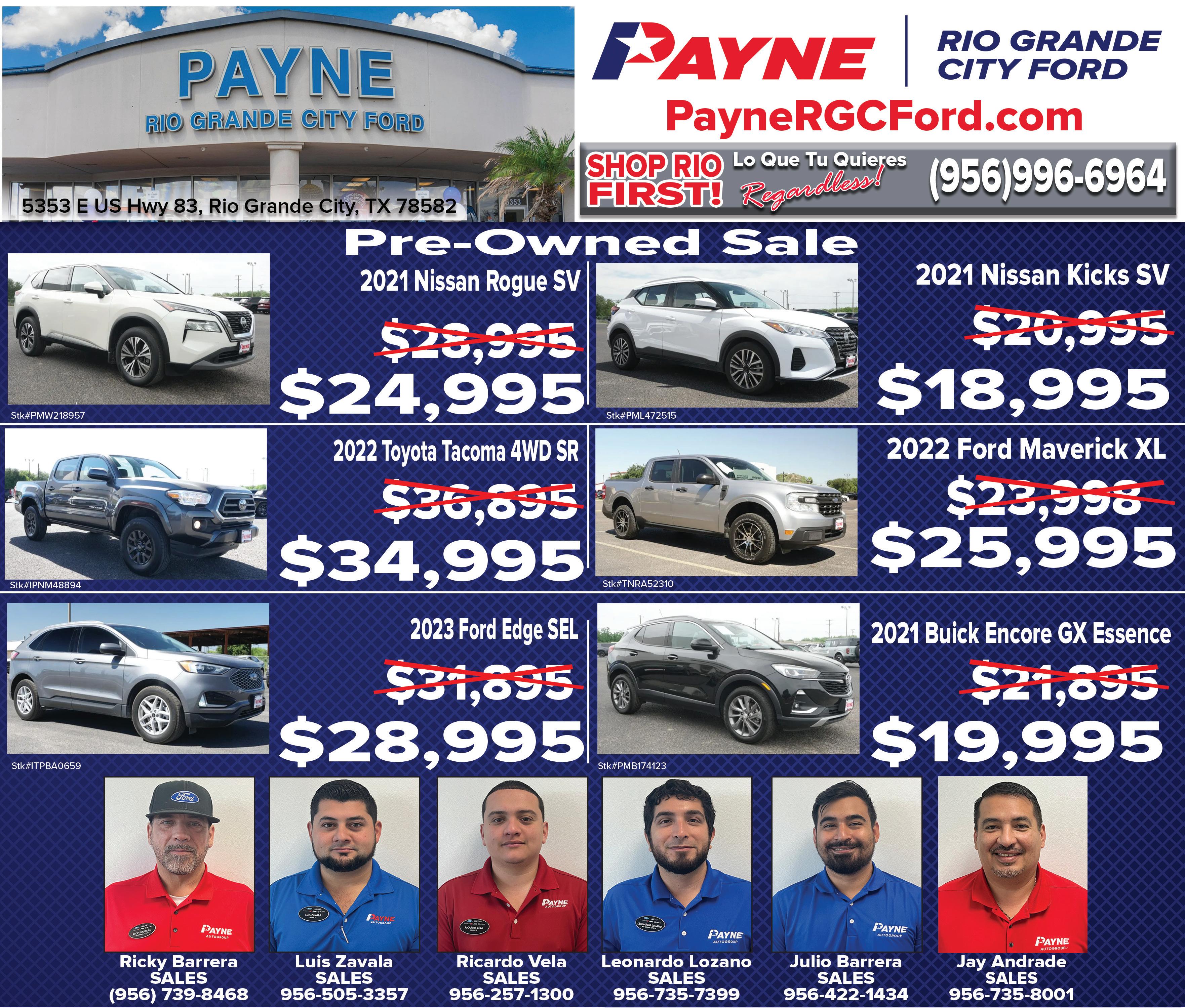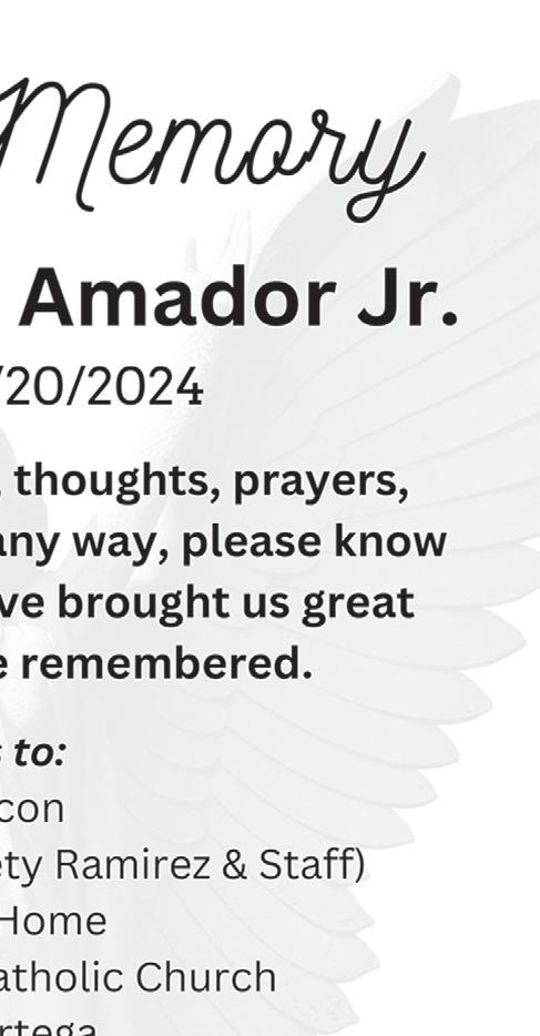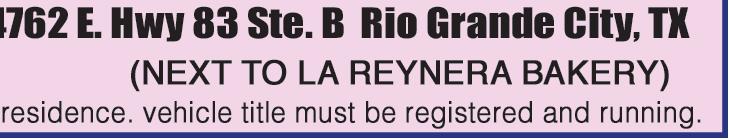 STARR COUNTY TOWN CRIER, MAY 8, 2024, PAGE 10 2021 Chevy TrailBlazer STK#25800A 2022 Ford F-150 Crew Cab XL People across the Valley come home to Rio Motor Co. for big savings and family-friendly service! No Matter Where You Live, Come Home! www.riomotors.com (956) 487-2596 · 1-800-509-0003 Rolando Flores 956-416-8945 Paco Cantu 956-208-1821 STK# 2544A ONLY 16K MILES!!! NICE! 2022 F-150 Crew XLT 4x4 STK#25813A 2022 Chevy Blazer LT STK#25822A MANAGER $PECIAL MANAGER $PECIAL STK# MUST GO!! CALL CALL CALL $33,995 $29,894 $38,995 $43,998 2022 Chevy Silverado 2500HD APARTMENT FOR RENT 1 bedroom, 1 bath w/ laundry, dinning, and living room appliances included. Newly remodeled 1 block away from North Grammar Elementary in RGC. For info. call 956-487-8989 307 papalote Road para mas información llamar al 956-435-4123 SE RENTA CASA Application has been made with the Texas Alcoholic Beverage Commission for a WINE AND MALT BEVERAGE RETAILER’S PERMIT (BG) by: OSCAR V. GONZALEZ JR. dba SIMPLE CAFE, to be located at 778 N FM 2360 STE A&B, RIO GRANDE CITY, STARR COUNTY, TEXAS. OWNER OSCAR V. GONZALEZ JR. LEGAL NOTICE 956-844-9303 NOW HIRING For more info. call Joel Housekeeper / ayuda con limpieza, preparar comida y organización (3-5 días por semana)