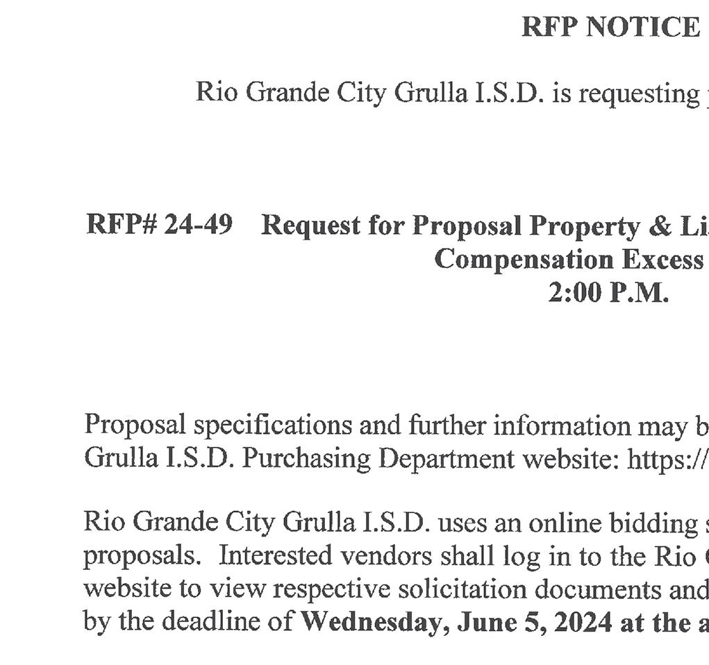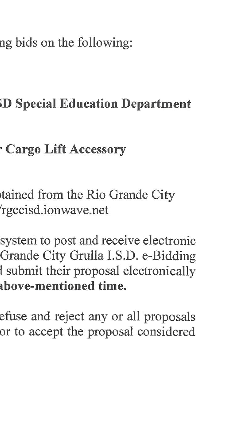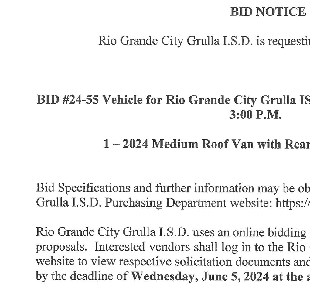 Sealed Bids will be accepted by the Starr County Precinct #3 office staff, at 6163 FM 1430, Rio Grande City, TX. Until 3:00 p.m. Thursday, May 23, 2024. Bids not received prior to the date and time set forth above will not be accepted for consideration.