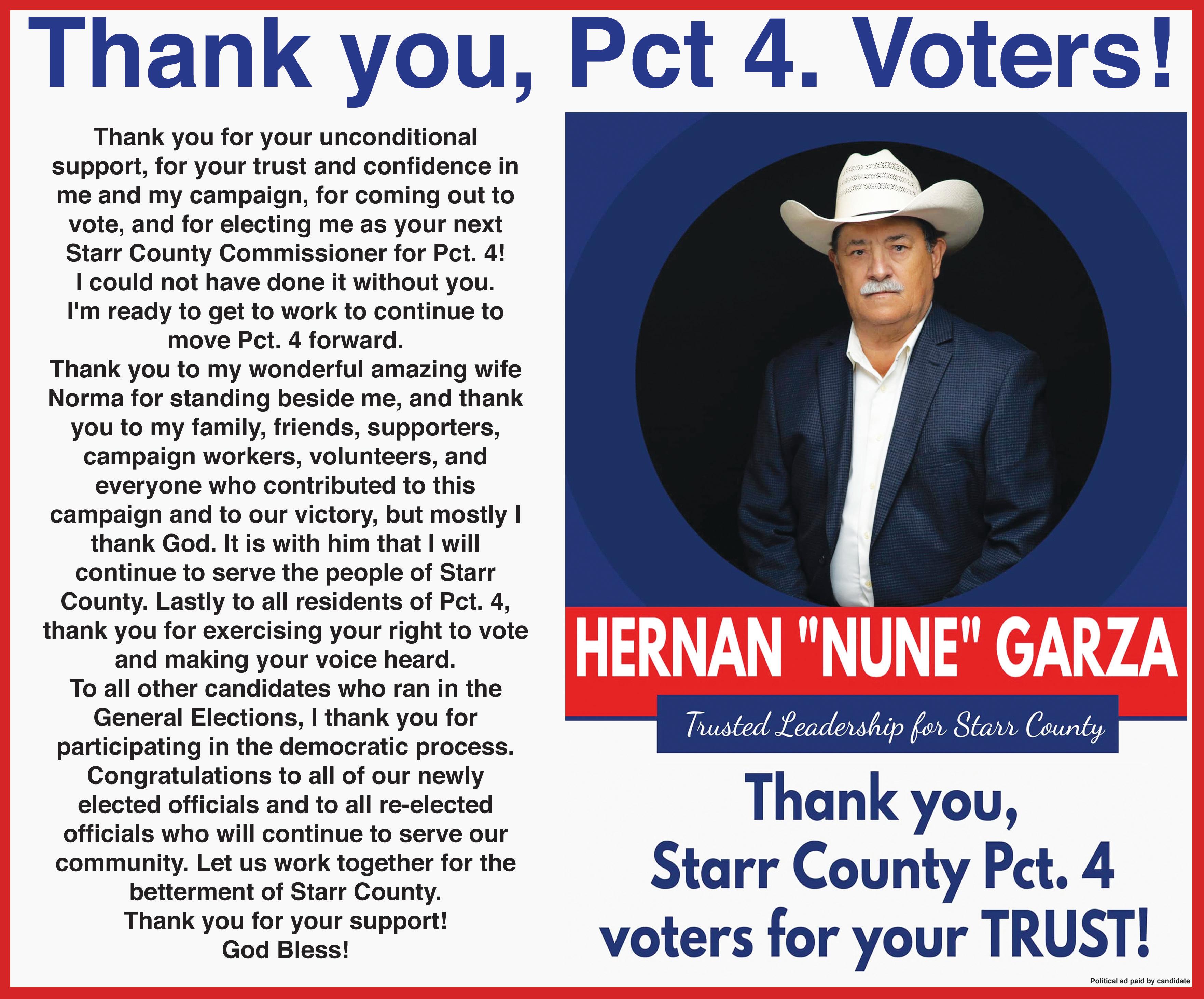 The County of Starr, is soliciting sealed bids to be received by Starr County Pct.#4 Commissioner Ruben D. Saenz at 100 N. FM 3167, Rio Grande City, TX 78582. Starr County’s normal business days are Monday thru Friday between the hours of 8:00 a.m. and 5:00 p.m.