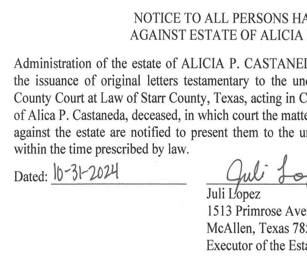 Notice is hereby given, pursuant to Chapter 263.153 of the Texas Local Government Code & Chapter 59 of the Texas Code of Criminal Procedure and Transportation Code 683, Subsection B, 683.012, of the Texas Department of Transportation that the County of Starr Sheriff ’s Office, Rio Grande City, Texas will hold a public auction on Saturday, November 23rd , 2024, at 10:00 a.m. for General Surplus, Equipment and Vehicles which have been forfeited to the State of Texas under the provisions of Chapter 59 Texas Code of Criminal Procedure. Location: 2101 I-69C, Edinburg, TX 78542. Registration to bid live will be from 8:00 a.m. to 10:00 a.m. and will require a picture identification or register online at www.bondauctioneers.com. Examples of items to be auctioned are cars, trucks, heavy equipment, personal computers, electronics, office furniture, surplus, etc. All items will be sold “As Is - Where Is” to the highest bidder. Onsite Buyer’s Premium 14%, Internet Buyer’s Premium 16%. All sales are final and must be paid on the same day with cash, major credit cards (Visa, Master Card, Discover, American Express), Debit & Credit with a 3.99% processing fee. Checks accepted “day of auction” only with certain conditions. For additional information, please contact the County of Starr Sheriff ’s Office, at (956) 4875571. AUC#17532 - Jose A. Camarillo