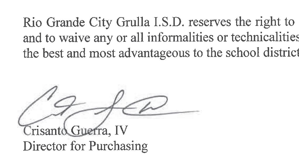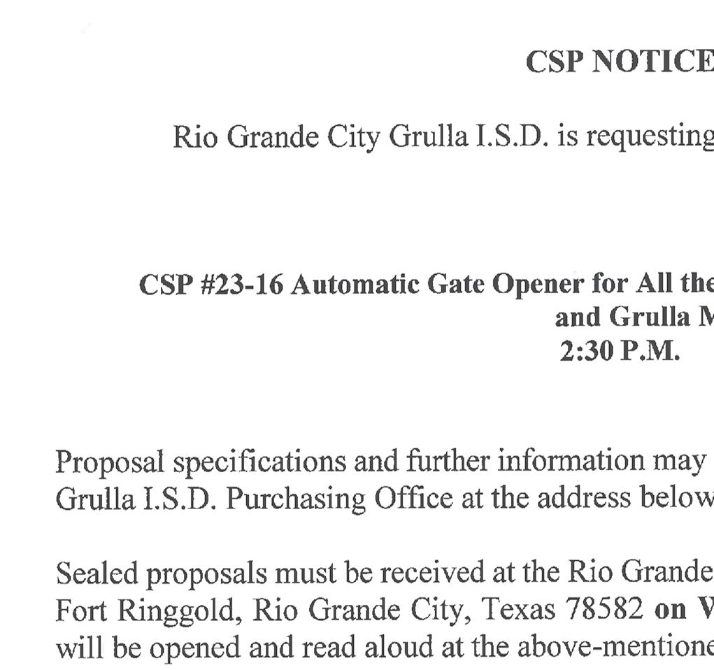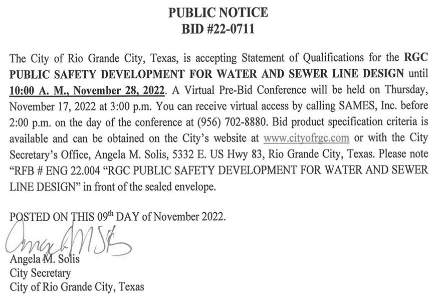 Deadline: Sealed bids will be accepted until Monday, November 28, 2022 at 10:00 a.m. at which time they will be opened in the City of Rio Grande Conference room at Physical Location: 5332 E. US Highway 83 Rio Grande City, TX 78582. No facsimiles or late arrivals will be accepted. Any bid received after that time will not be opened and will be returned.