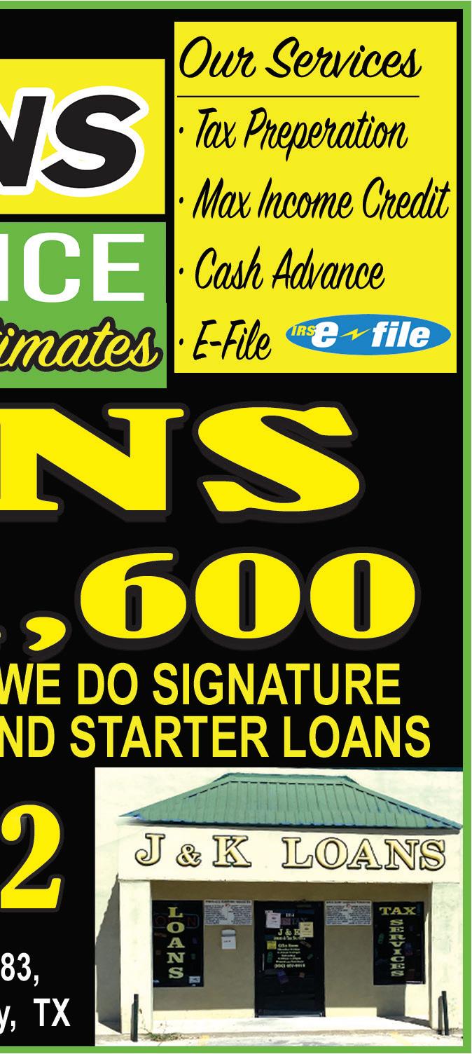487-2440 300 East Main St. R.G.C. STARR VISION CENTER Dr. Angie Ramirez erapeutic Optometrist 488-0808 280 W. 2nd St. R.G.C. CASTAÑEDA Auto Insurance & Bail Bonds 487-7000 487-2596 4350 E. US HWY 83 R.G.C. • Individual • Partnership • Corporations • LLC’s • Bookkeeping • Payroll • Financial Statements • Form 2290 • IRS Audit Representation Mario A. Méndez, EA Licensed to practice before the IRS (Internal Revenue Service) 317-1124(956) 201 S. San Antonio. St. Rio Grande City, TX (NEW LOCATION) Vol. 37, No. 45 WEEKLY WEDNESDAY • NOVEMBER 9, 2022 Office (956) 487-6544 - Fax (956) 487-6165 - E-Mail: sctc78582@aol.com - www.starrcountytowncrier.com OPEN MON-SUN 7AM-7PM 956-487-2140 5470 E. HWY 83 R.G.C. TX 956-519-3237 • 6601 W. HWY 83 - MISSION, TX BIG DOOR SALE LARGE SELECTION WE HAVE A NEW LINE OF DOORS AVAILABLE The Law Office Of 956-317-1167 206 N. Britton Ave. Ste.B, R.G.C. jmchemagarza@gmail.com J.M. “Chema” Garza Criminal Cases (Federal/State) Car Accidents/ 18 Wheeler Divorces • Real Estate/Deeds Dr. Raymond Cruz Best FAMILY & COSMETIC DENTISTRY Dental Insurance, Medicaid and Chip Accepted 419 East 2nd St. Rio Grande City, Tx. 487-2999 311 E Main St Rio Grande City TX 78582-4448 Phone (956) 487-3925 Installment Loans